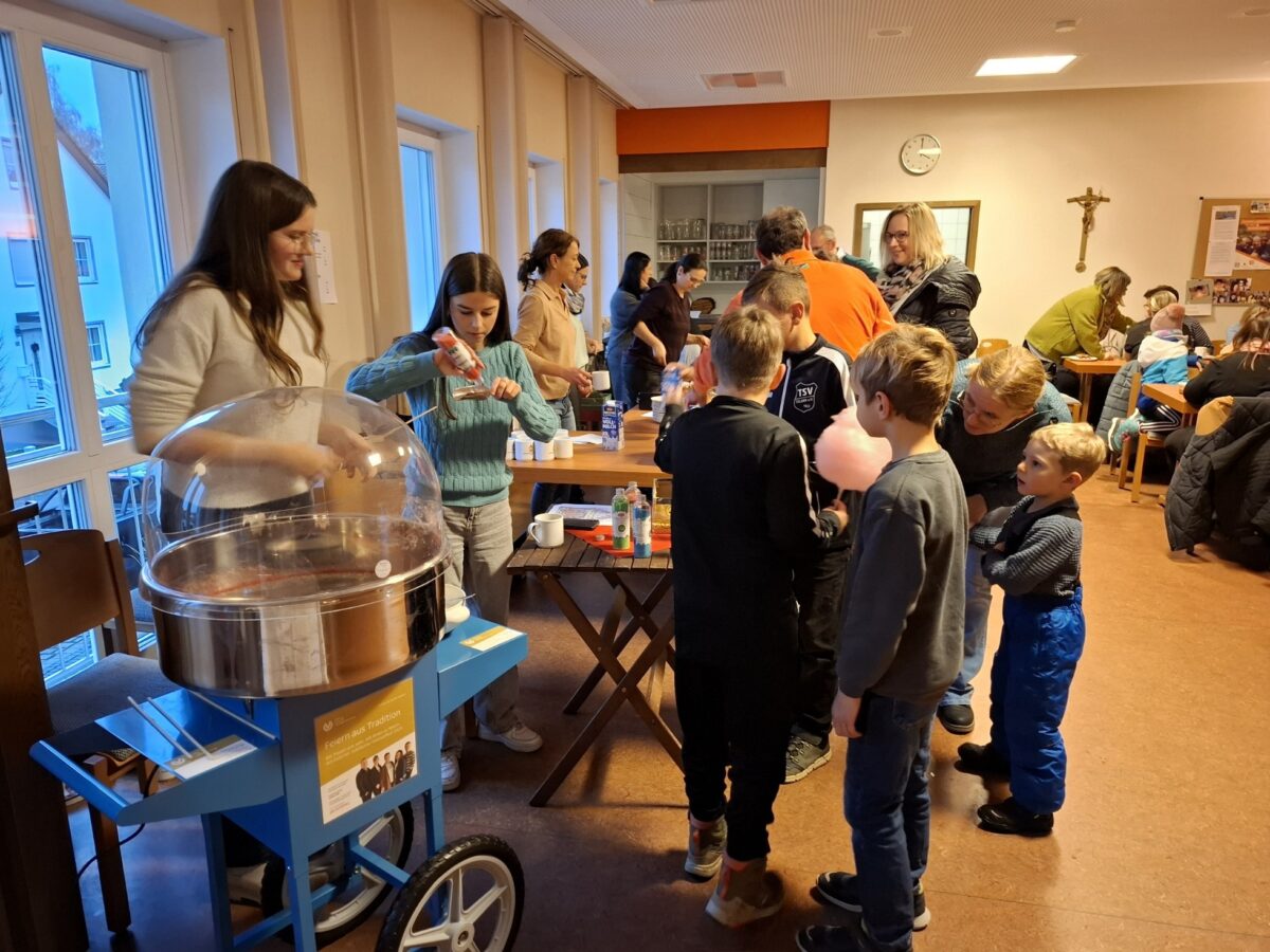 Am Außenstand wärmten sich die Besucher mit einem Glas Punsch, während Siegfried Sier und Christian Hammerl köstliche Bratwürste anboten. Im Pfarrheim verwöhnte der Elternbeirat der Grundschule die Gäste mit Kaffee und einer großen Auswahl an selbstgebackenen Kuchen sowie Kinderpunsch. Sehr beliebt bei den jüngsten Gästen war die selbstgemachte Zuckerwatte am Stand der Ministrantinnen.