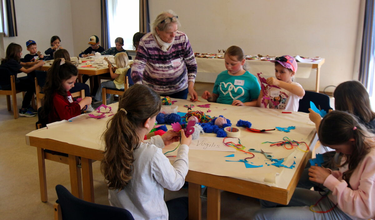 Der Renner in den nach Themen vorbereiteten Stationen war die Erstellung eines Hühnerstalles auf schlichten Papptellern. Deren Gestaltung mit Farben und Accessoires war wahlweise möglich, der Fantasie keine Grenzen gesetzt.