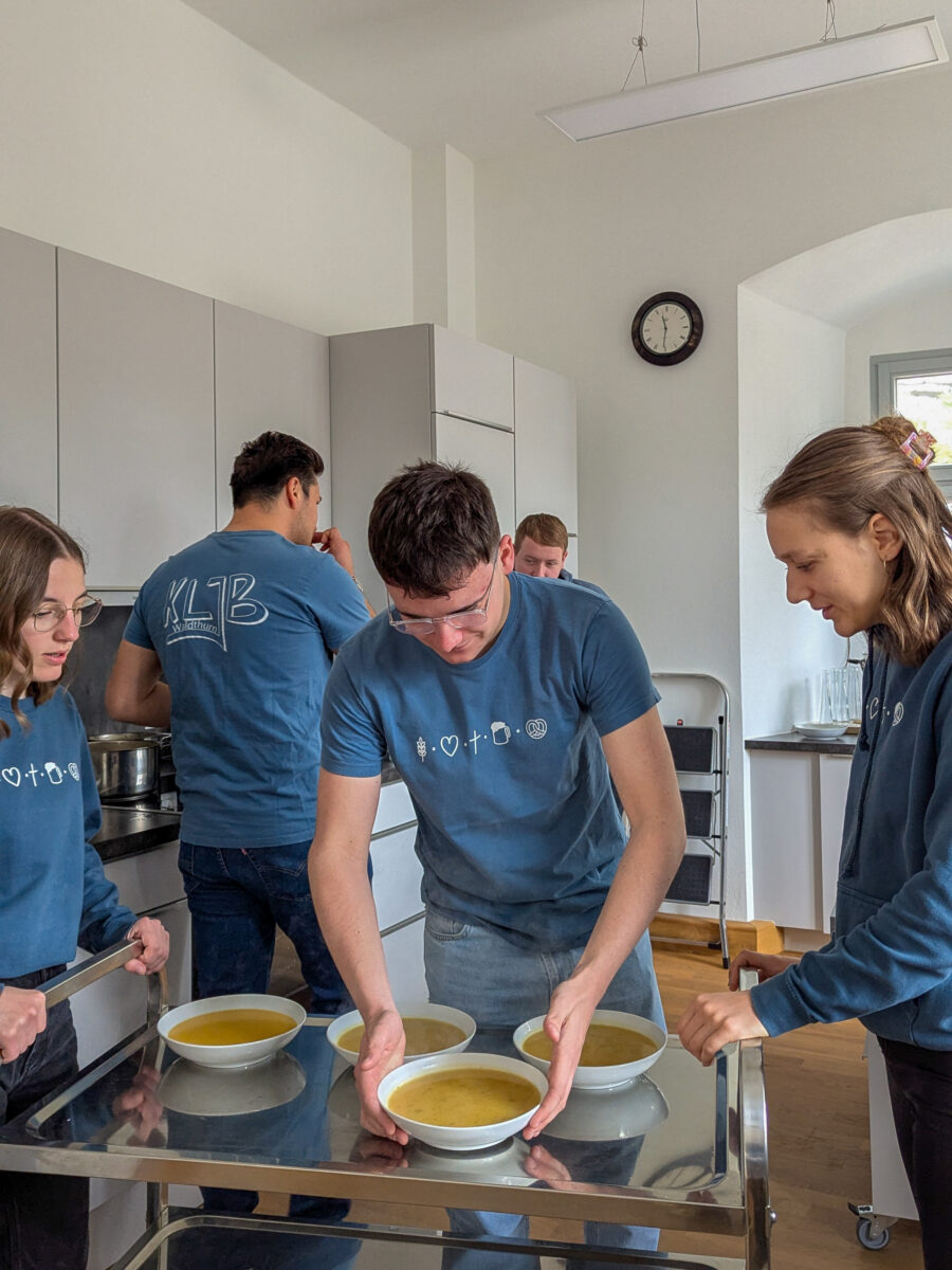Kurz vor dem großen Ansturm der Besucher wurde das frische Steinofenbrot geschnitten und die Tische gedeckt. Dass Küchenarbeit keine reine Frauensache ist, bewiesen die Landjugendburschen eindrucksvoll. Sie servierten Suppe, Brot und Mineralwasser und packten auch beim anschließenden Spülen mit an. Der Erlös des „Löffeln und Gutes tun“ geht an die Lennesriether Schwester Diane, nach Südafrika.