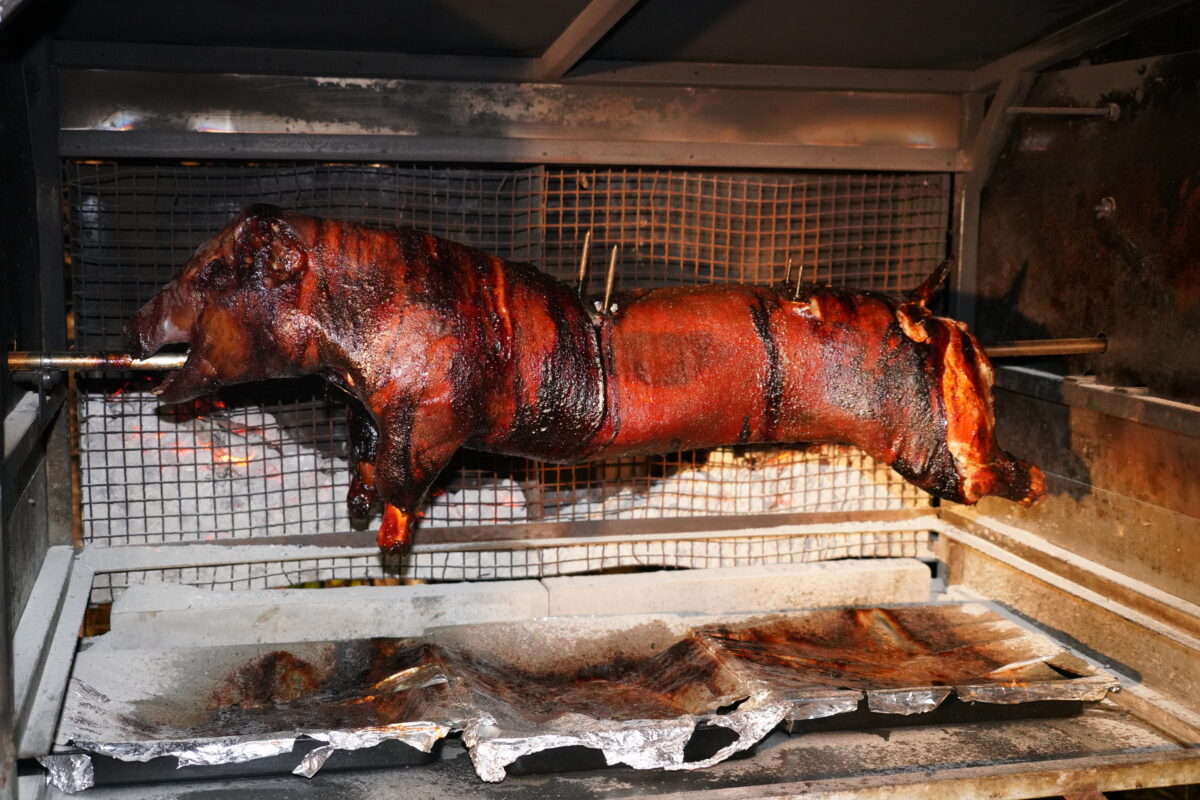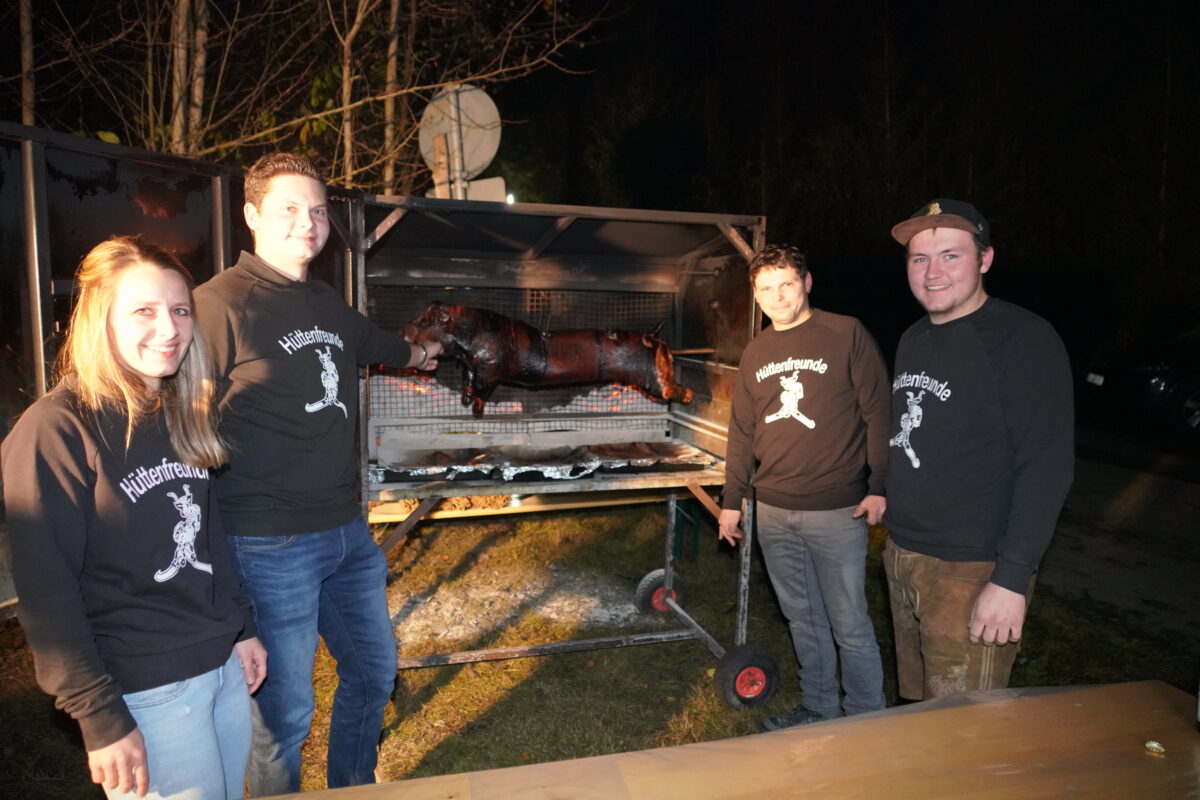 Bereits Mittag um 12 Uhr hatte man die Sau in den „Hochleistungsgrill“, der ein altes Balkongeländer als Untergestell hat, gehängt. Die Temperatur von 150 Grad wurden durch Holzbefeuerung bis kurz vor Schluss gehalten – hier legte man noch eine Schippe drauf, um bei 200 Grad die leckere „Hüttenfreunde – Kirwasaukruste“ zu erreichen.