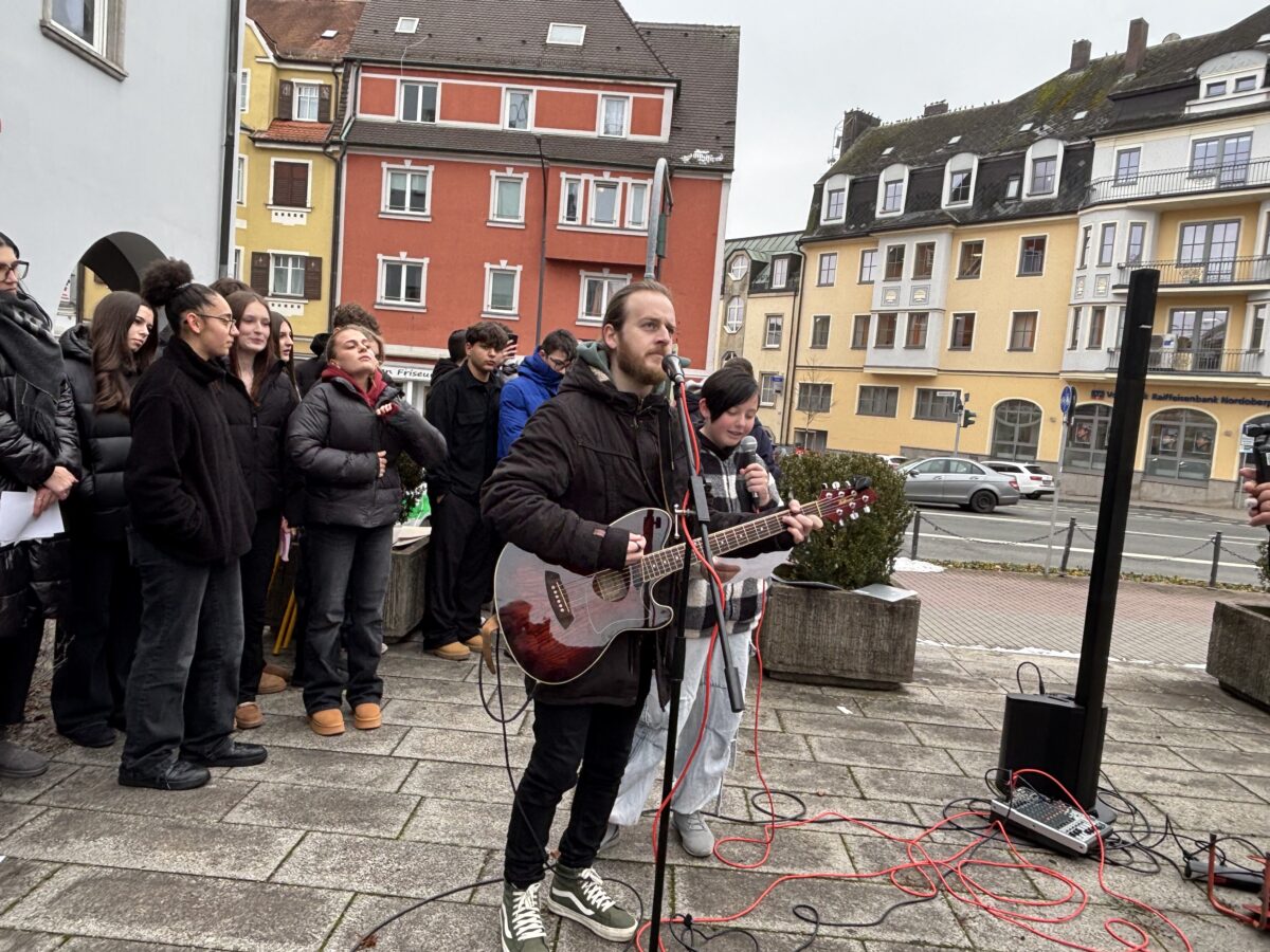 Die Schüler schlüpften in die Rollen der Familienmitglieder – Lina Bernhard als Klara Thomé -, die sich immer mehr von der Gestapo eingekreist sehen. Eindrucksvoll stellten sie die zunehmende Verzweiflung und Todesangst der zweifachen Mutter dar. Musiklehrer Peter Greiner sang “Imagine” von John Lennon.