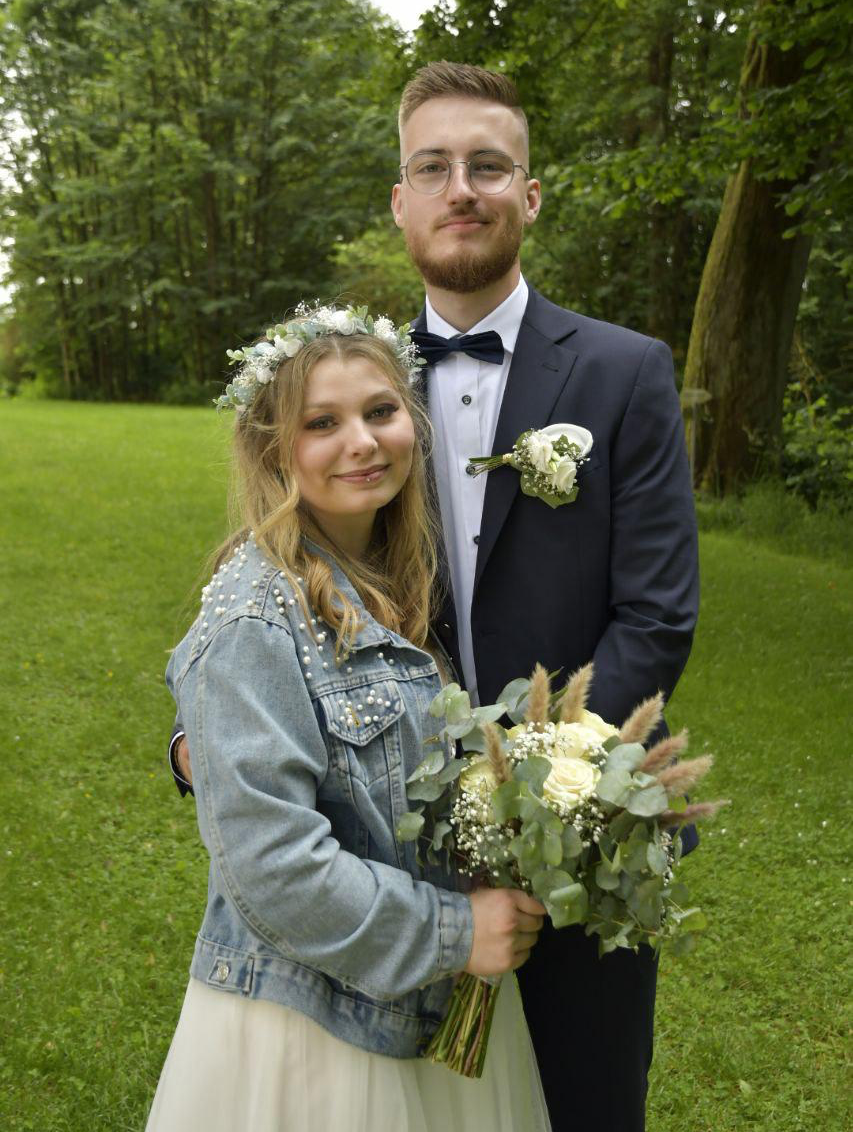 Die 22-jährige Braut aus Altenstadt und der 21-jährige Bräutigam, ehemals aus Püchersreuth, haben sich in Döllnitz niedergelassen. Die Familie des Bräutigams kaufte 2021 ein ehemaliges Wirtshaus im Dorf, das nun ihr Zuhause ist. Die junge Familie, zu der auch der drei Monate alte Sohn Noah gehört, wurde zusätzlich durch die Trauzeugen Michelle, die Schwester der Braut, und Simon, den Zwillingsbruder des Bräutigams, unterstützt.