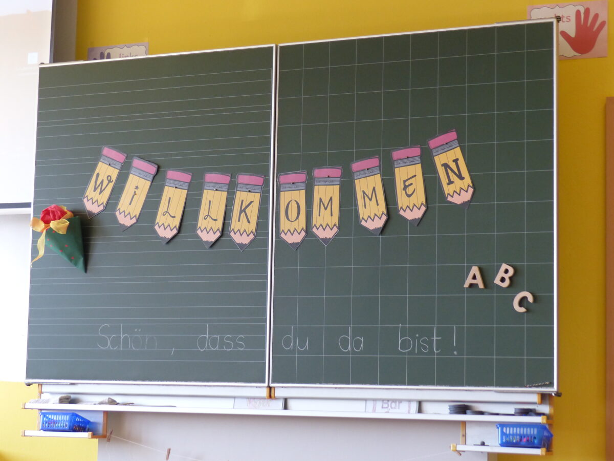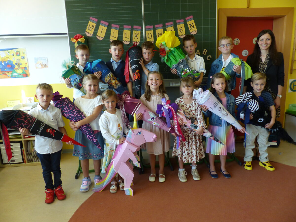 Von ihrer Klassenleiterin, Sonja Kramer, wurden sie im Klassenzimmer mit ihren Eltern empfangen und an Hand von Namenskärtchen wurden sie ihren Plätzen zugewiesen. Die erste Aufgabe der Kinder war es, diese Namenskärtchen auszumalen und die erste Hausaufgabe ist, dass sie bis zum nächsten Tag den Inhalt ihrer Schultüte malen.