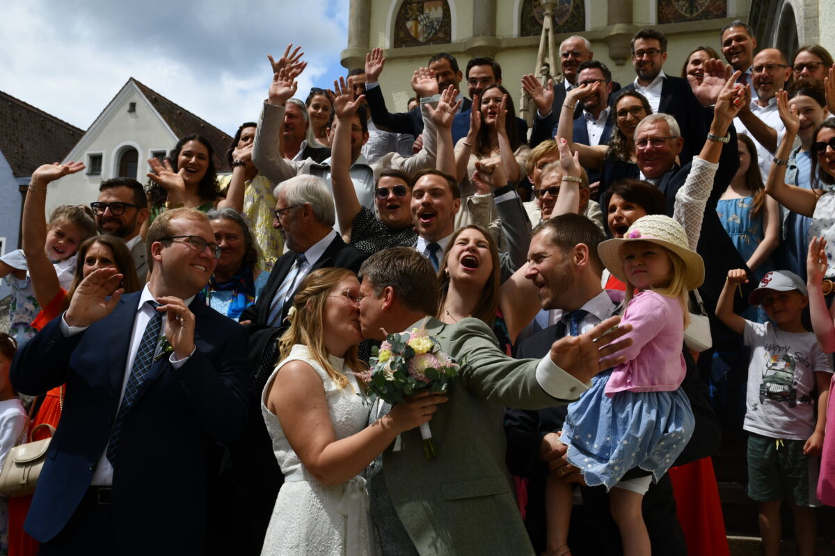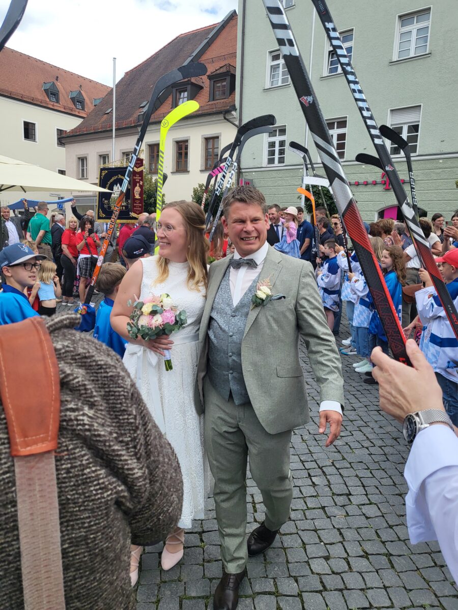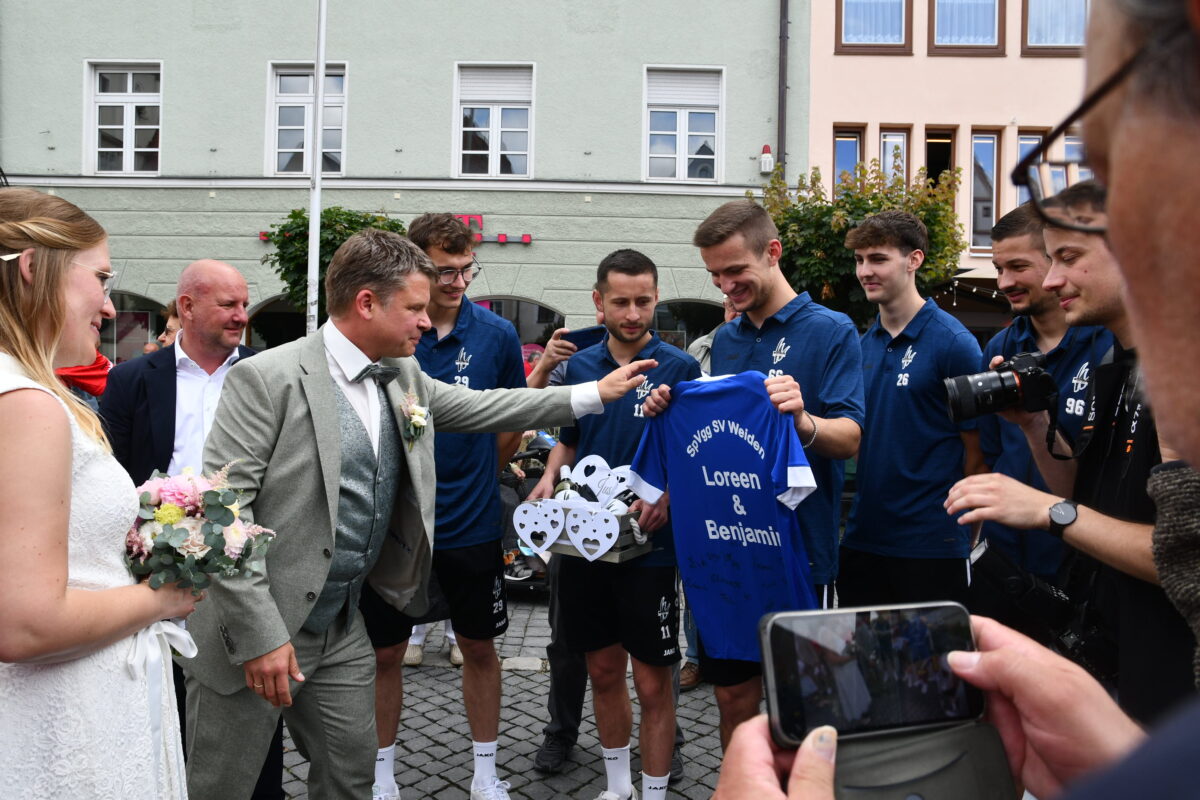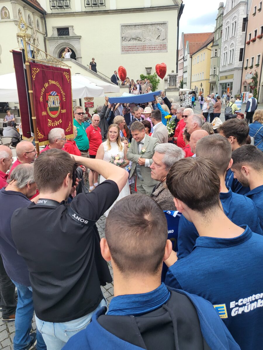 Benjamin Zeitler ist Mitglied in über 60 Vereinen und dabei auch in einigen Vorständen aktiv. Nach der Trauung musste sich das Paar also zuerst einen Weg durch ein Spalier aus Gratulanten bahnen. Dort überbrachte unter anderem die CSU mit Kreisvorsitzendem Stephan Gollwitzer ihre Glückwünsche. Dahinter reihte sich der Altoberpfälzer Freundeskreis, der FC Weiden-Ost, die SpVgg SV Weiden, mit Präsident Michael Kurz, der 1. EV Weiden, mit Geschäftsführer Franz Vodermeier und einer Abordnung der Young Blue Devils, die Rothenstädter Burschen und der Serviceclub Round Table 49 Weiden.