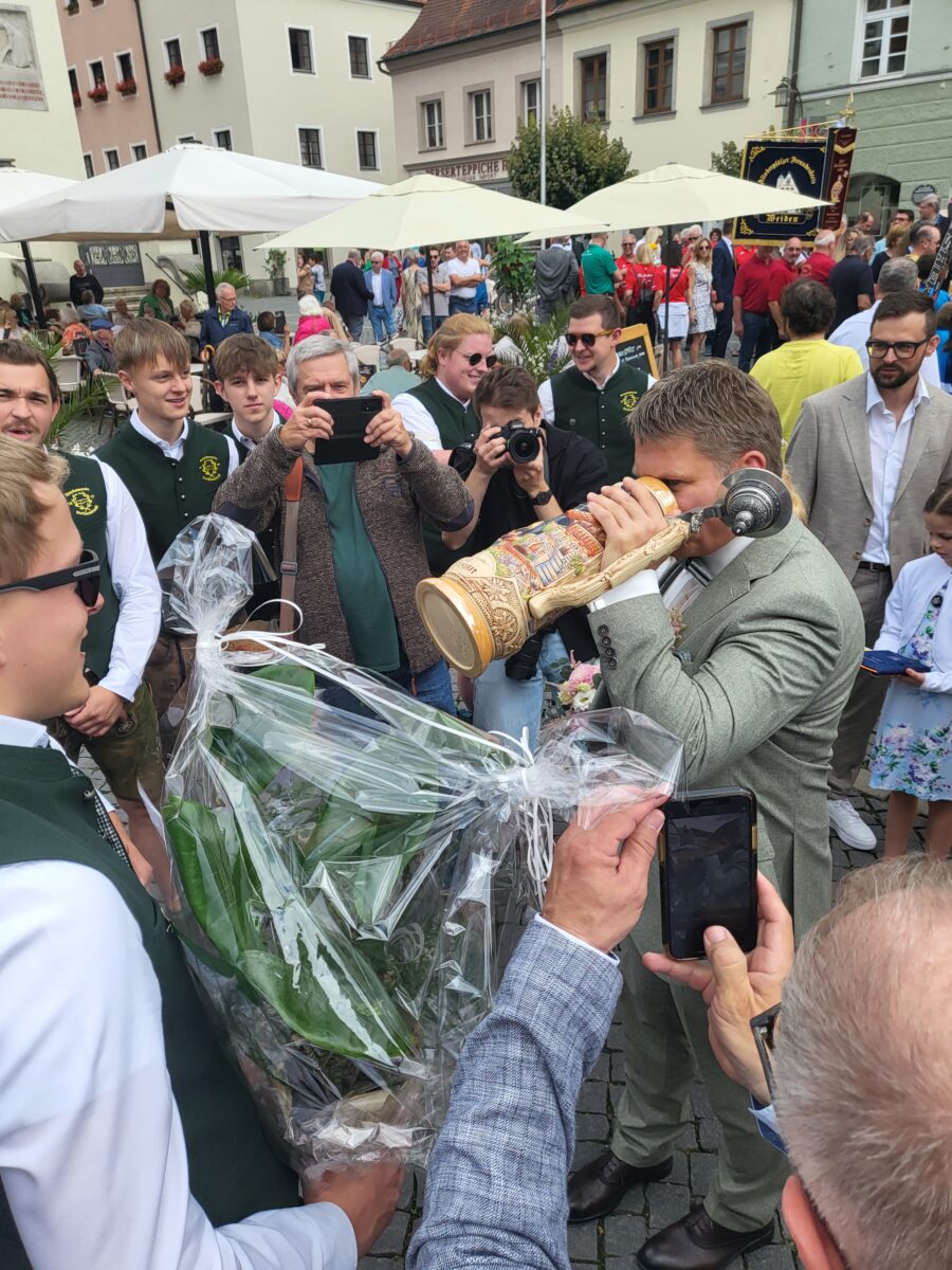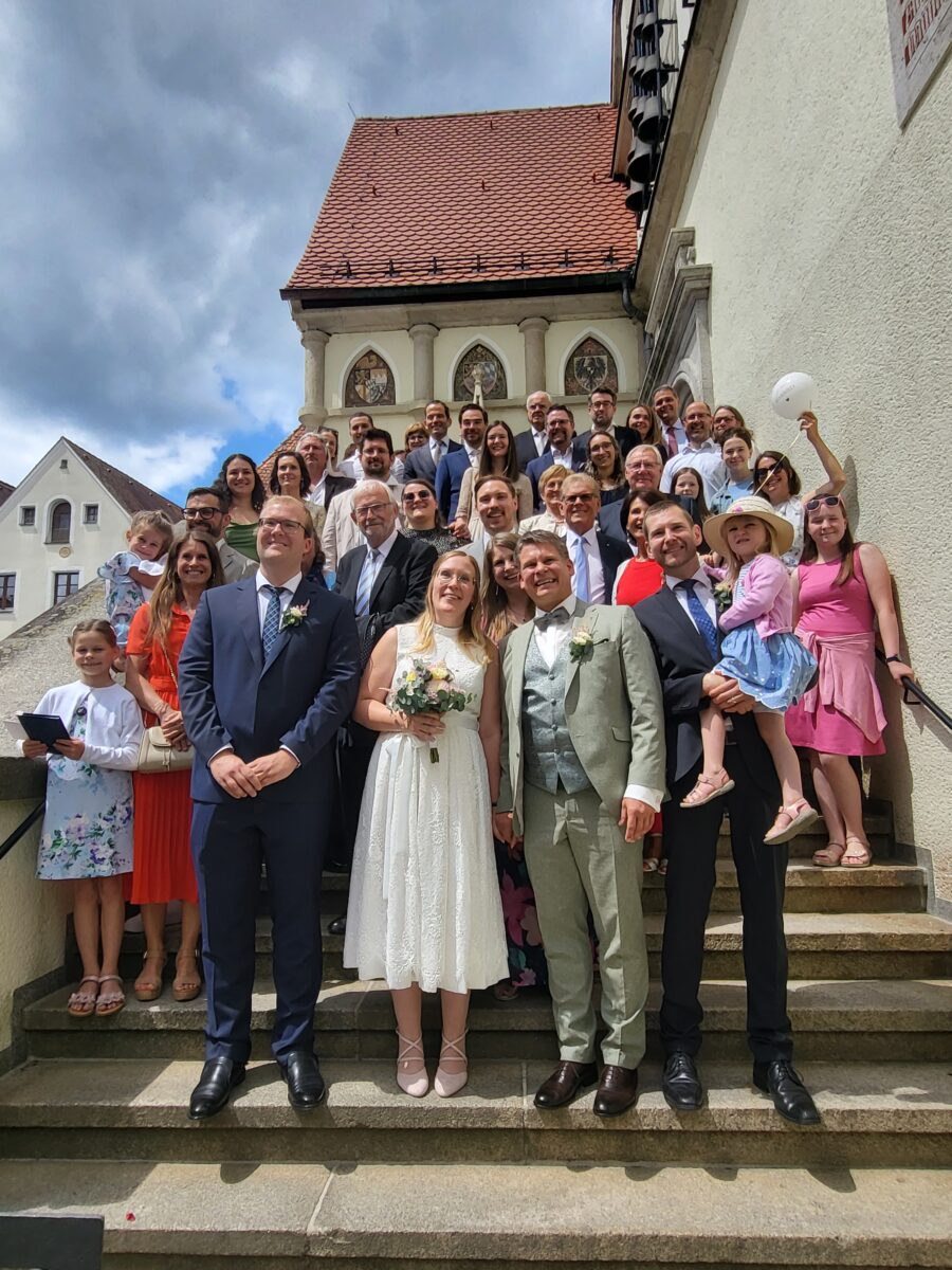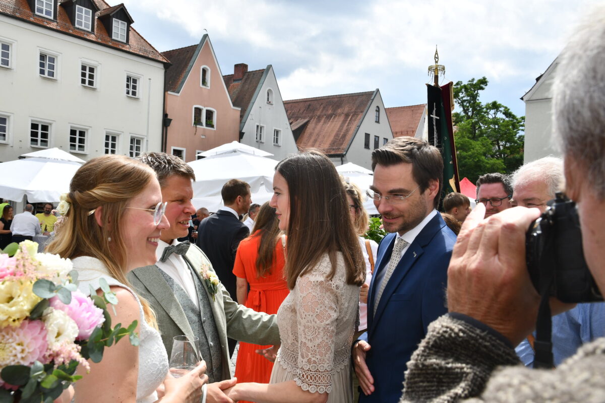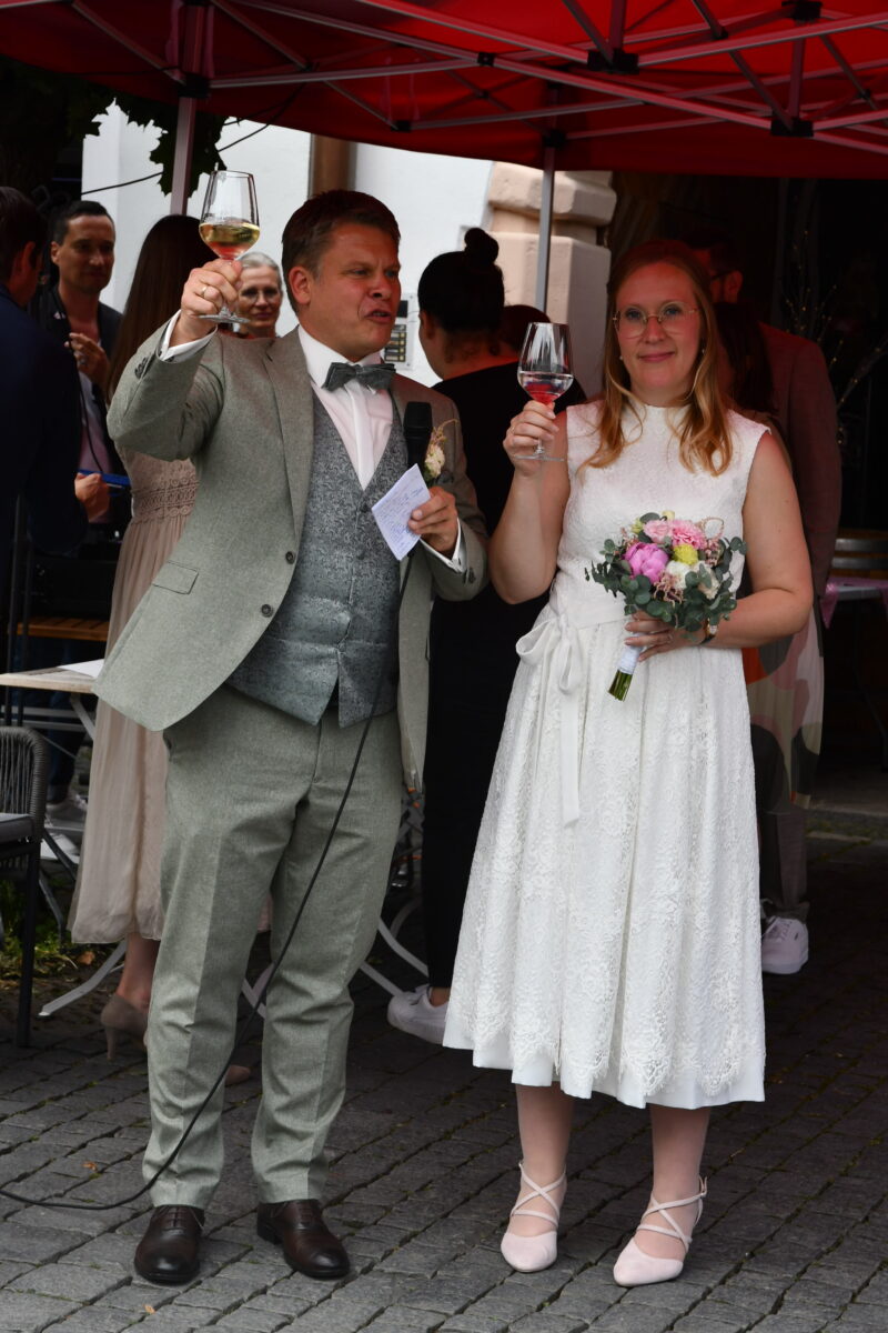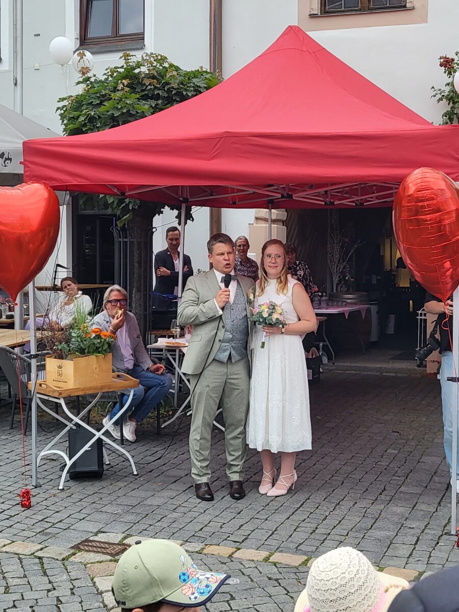 Benjamin und Loreen (39) haben sich im Januar 2023 in Regensburg kennengelernt. Es hat sofort gefunkt und mittlerweile leben die beiden im Weidener Ortsteil Rebühl. Die leitende Betriebsärztin der Medbo und der Vorsitzende der CSU-Stadtratsfraktion wollen sich im kommenden Jahr auch noch kirchlich trauen. Die beiden waren sichtlich gerührt von der Schar an Gästen: “Wir sind völlig überwältigt! Wir haben heute gleich doppelt Grund zu feiern, denn das schönste Geschenk erwarten wir im Herbst!” Dann wird aus dem Ehepaar Zeitler die Familie Zeitler. Herzlichen Glückwunsch!