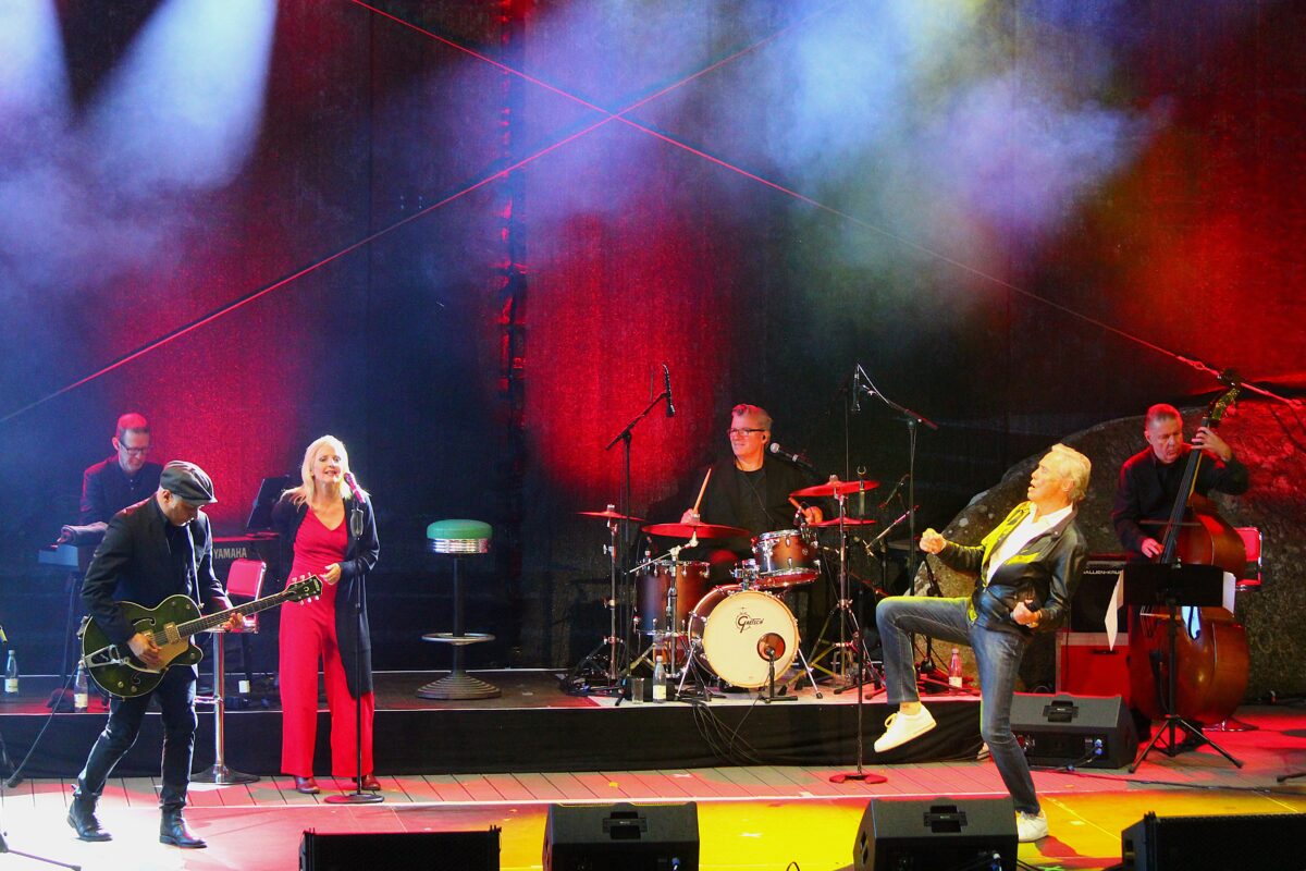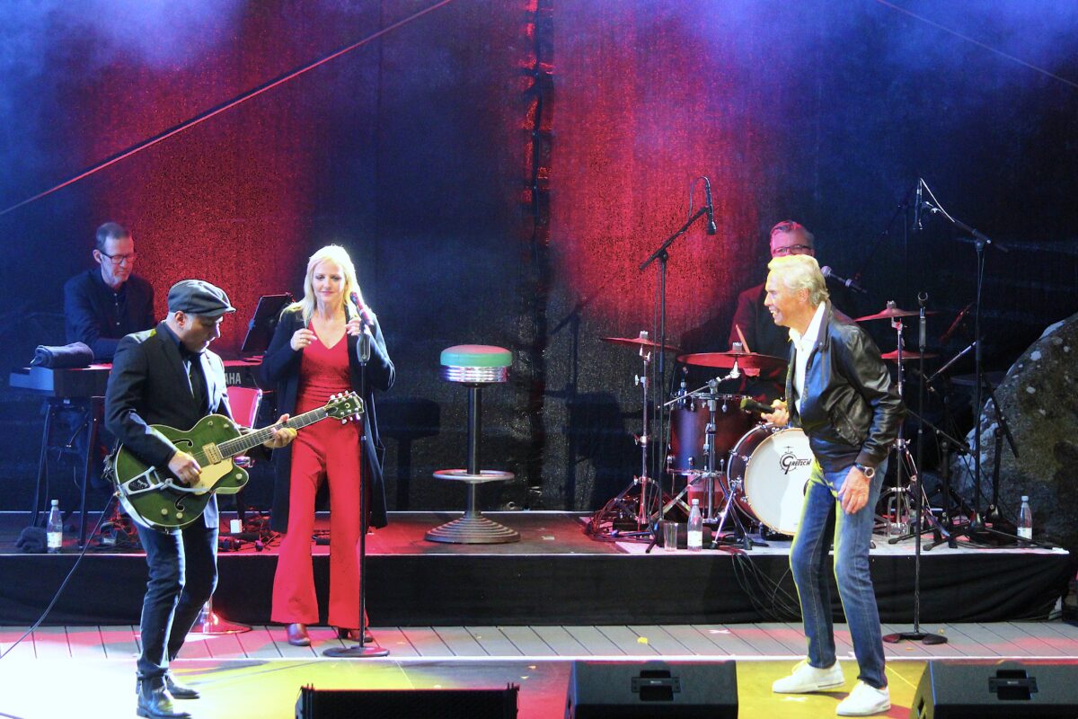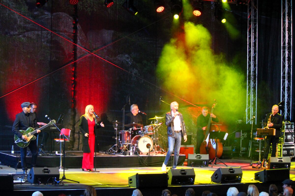 Zwischendrin gibt Kraus immer wieder Geschichten zum Besten – so über sein zufälliges Treffen mit Sammy Davis jr. an einer Hotelbar in Monte Carlo, seinen Bühnenauftritt mit Louis Armstrong, den Besuch der Geburtstagsfeier von Paul Anka in Paris und auch darüber, wie Conny (Froboess) dafür ausschlaggebend war, dass er den Beruf des Sängers ergriff. Dass es zu einem durch und durch gelungenen und mitreißenden Konzertabend auf der Luisenburg wird, hat aber noch zwei andere Säulen: Zum einen die fünfköpfige Begleitband und zum anderen die Sängerin Sandie Wollasch, die jeweils starke musikalische und gesangliche Akzente setzen.