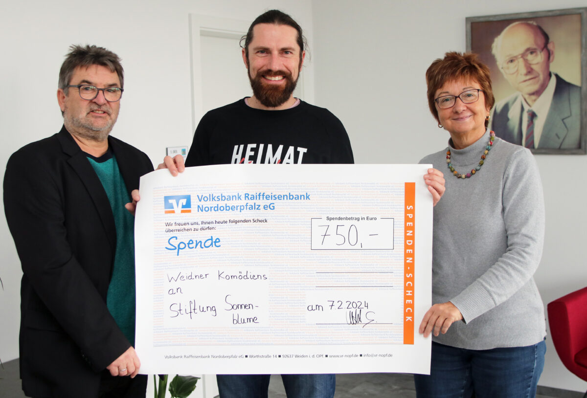 Der Vorsitzende Sandro Witt überreichte der „Stiftung Sonnenblume“ des Heilpädagogischen Zentrums (HPZ) Irchenrieth eine Spende in Höhe von 750 Euro. Das Geld, so Witt, stamme aus dem Gesamterlös von 1500 Euro aus den acht Aufführungen des Stückes „Der Landkreis-Casanova“. Die gleiche Summe ging an das Hospiz St. Felix in Neustadt/WN.