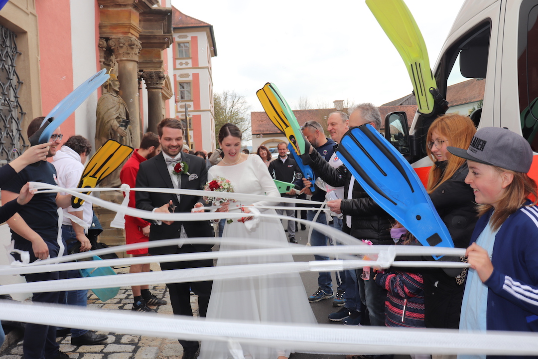 Nach der Martinshornbegrüßung durch den Wasserwachtbus, erwarteten die Kollegen des Bräutigams, die Mitarbeiter der Verwaltung des BRK Kreisverbands Weiden/Neustadt, ihren Verwaltungsleiter Josef mit seiner Ehefrau Annika, mit der ersten Aufgabe: Aus einem großen Laken schnitten die beiden Frischvermählten ein großes Herz, durch welches Josef seine Annika tragen durfte.