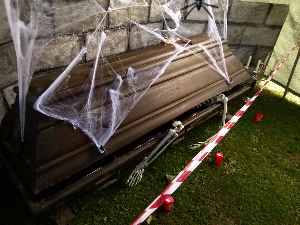 Wer sich einen Weg durch die Gräberreihen bahnt, muss aufpassen. Da liegt ein blutverschmiertes blutiges Bein, das zum Zittern anfängt, wenn man drüberstolpert. Aus einer Kiste dringen Klopfgeräusche und aus einem echten, 70 Jahre alten Holzsarg entsteigt urplötzlich der Knochenmann. Und auch Wolfgang Fleischer selbst macht als Zombie eine erschreckend gute Figur.