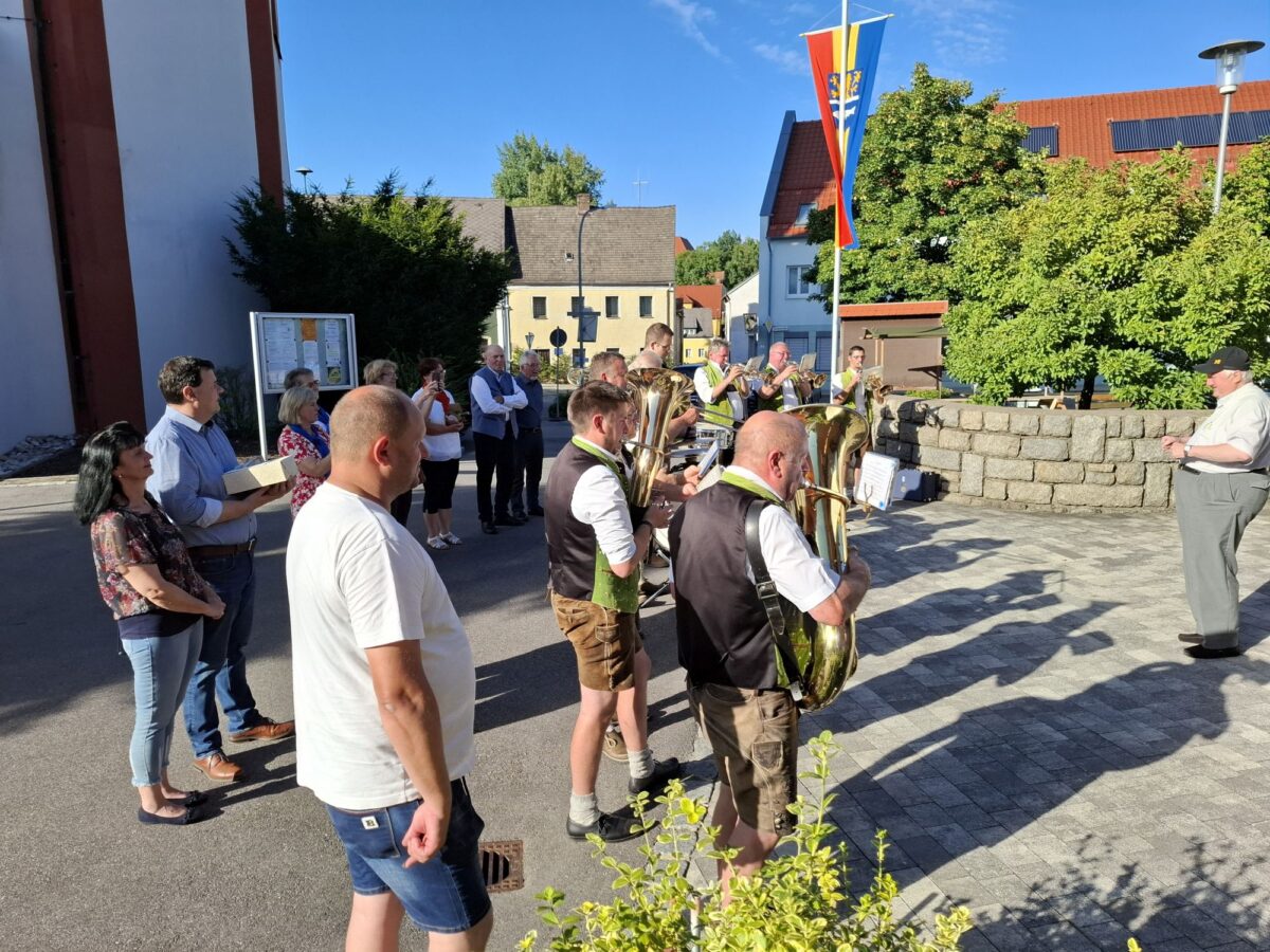 “Es war eigentlich eine Wettschuld, die ich einlösen wollte und der Geburtstag bot sich an.” Bei der Faschingsveranstaltung im Vorjahr hatte Grießl Pfarrer Erwin Bauer versprochen, ihm zum 70. Geburtstag ein Ständchen zu singen. “Da ich lieber musiziere, wurde aus dem Gesang eine ganze Blaskapelle.” Nach einem Walzer folgte „Tief drin im Böhmerwald“ und mit “Muss i denn, muss i denn, zum Städtele hinaus” wiesen die Musiker auf die bevorstehende Pensionierung des Pfarrers und den Umzug Ende August nach Oberviechtach hin. Im Anschluss durfte Pfarrer Bauer viele Hände schütteln. Die kirchlichen Vertreter bei der Feier dankten “ihrem Pfarrer” für das 22 Jahre lange seelsorgliche Wirken und das gute Miteinander.