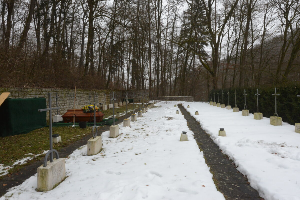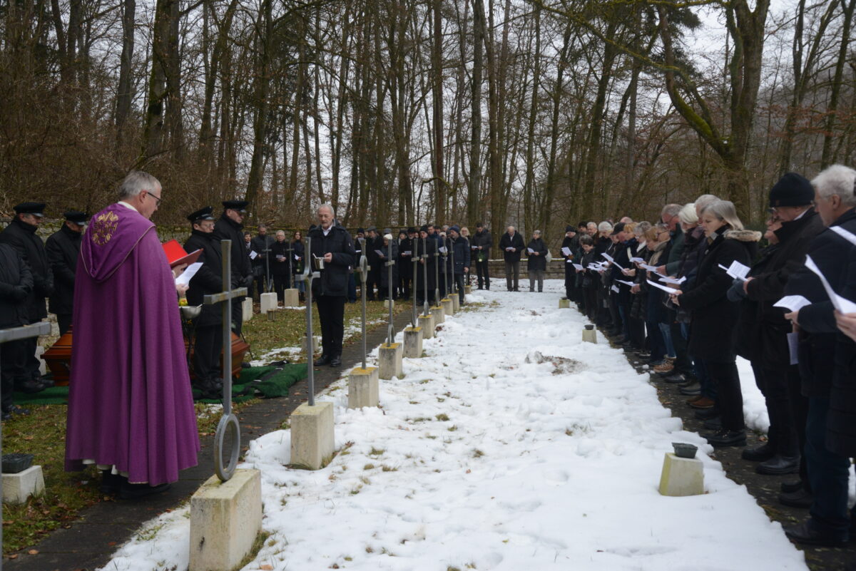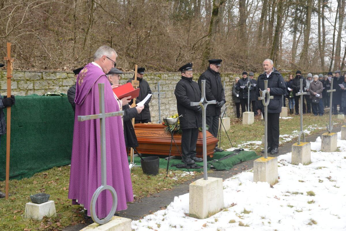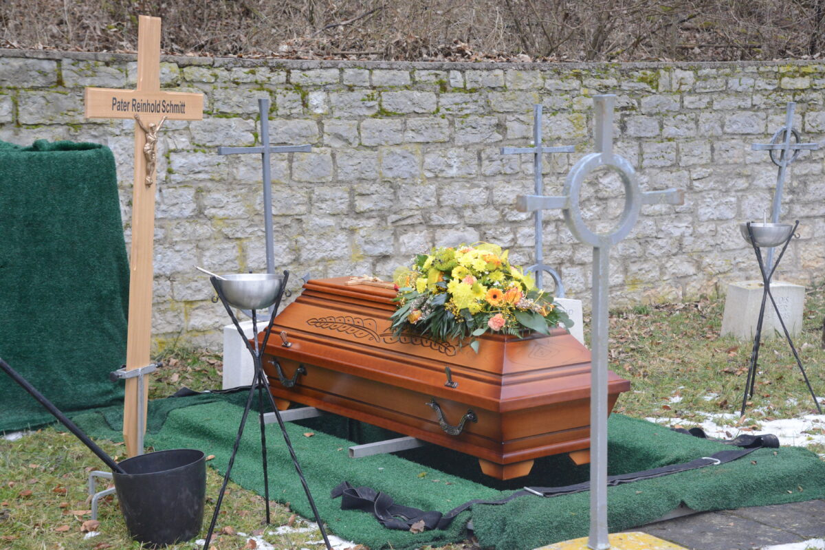 Die Wetterverhältnisse ließen es nicht zu, dass die Trauergemeinde gemeinsam in einem Leichenzug vom Salesianum zum höher gelegenen Friedhof zog. Dort befinden sich in verschiedenen Ebenen die Gräber der verstorbenen Oblaten des heiligen Franz von Sales. Das letzte Geleit gaben Pater Reinhold Schmitt viele Glaubensbrüder, Pater Provinzial Josef Köttringer, Wien, sprach die Gedenkrede, die vielen Trauergäste, darunter die Bürgermeister Günther Werner, Haßfurt, und Rainer Rewitzer, Pleystein, Verwandte, Freunde und Bekannte von Pater Reinhold Schmitt sowie viele trauernde Gläubige aus Haßfurt und Pleystein, verharrten am Grab, wo der Sarg, zunächst noch sichtbar aufgestellt und mit einem Blumenbukett geschmückt, war.