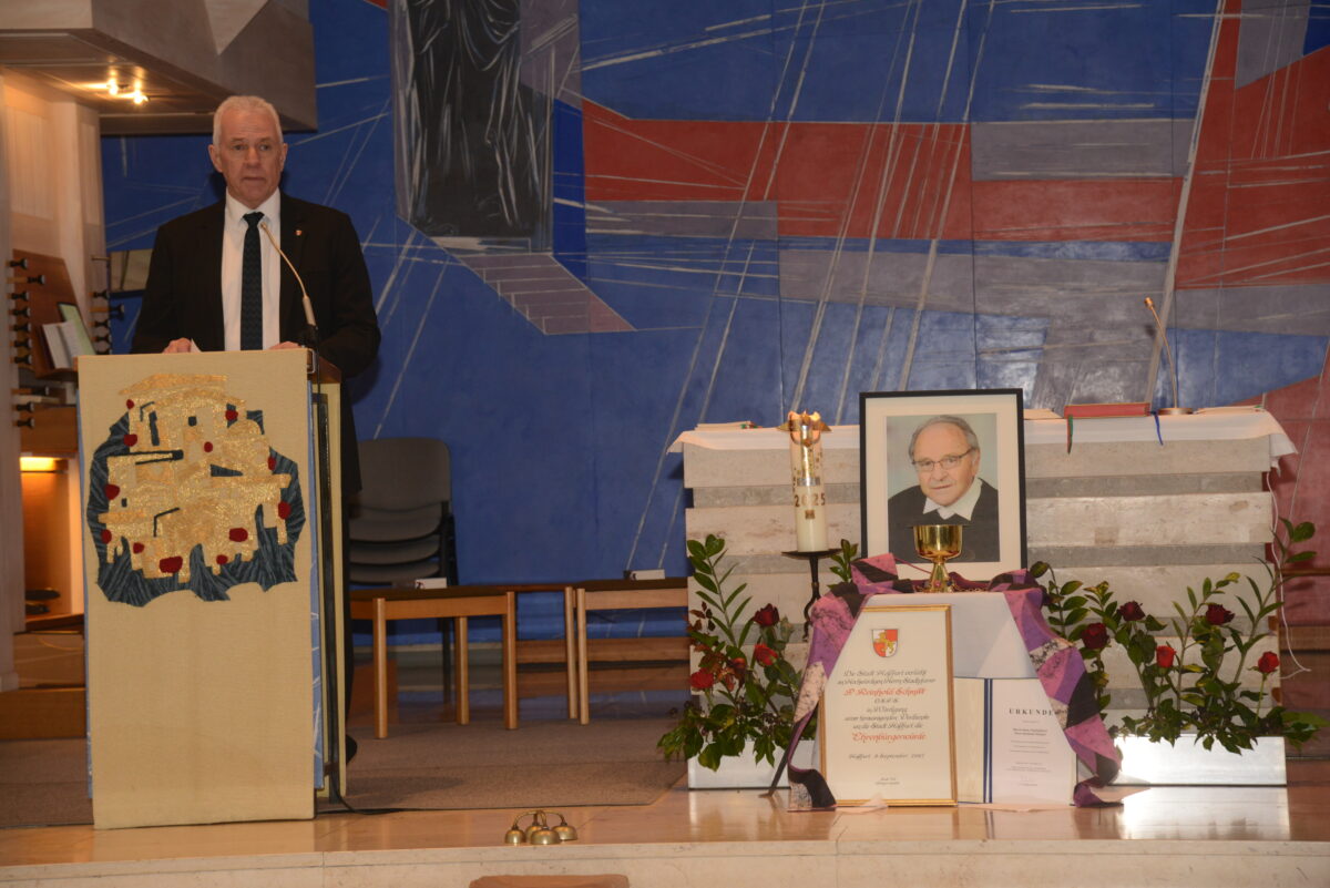 Haßfurts Bürgermeister Günther Werner nannte Pater Reinhold Schmitt „einen Freund und Wegbegleiter vieler Generationen“. Der jetzt schwerfallende Abschied sei getragen von Dankbarkeit für ein Wirken, das die Stadt Haßfurt und viele Menschen nachhaltig geprägt habe. „Er war immer da, wenn man ihn brauchte.“ Nicht von ungefähr standen deshalb im Mittelpunkt seines Handelns die Menschen – unabhängig von ihrem Alter, ihren persönlichen Problemen oder dem Weg auf eine gemeinsame Zukunft. Und auch bei den Abschiedsworten des Haßfurter Bürgermeisters wird deutlich, dass der verschmitzte Humor Schmitts manches Gespräch leichter gemacht habe. „Er hat für seine Arbeit große Wertschätzung erfahren.“ Bürgermeister Werner hob hervor, dass selbst der Weggang Schmitts nach Pleystein die Verbindung nach Haßfurt nicht habe unterbinden können. Die Verleihung der Ehrenbürgerwürde der Stadt Haßfurt sei der Ausdruck tiefer Dankbarkeit und Anerkennung gewesen, betonte Haßfurts Stadtoberhaupt. Reinhold Schmitt habe Spuren in den Herzen der Menschen hinterlassen – solche des Glaubens, der Menschlichkeit und der Hoffnung.