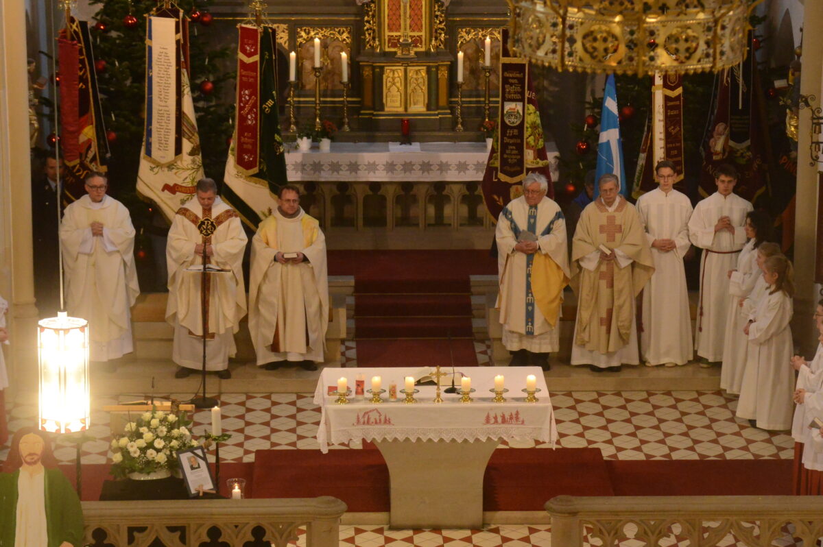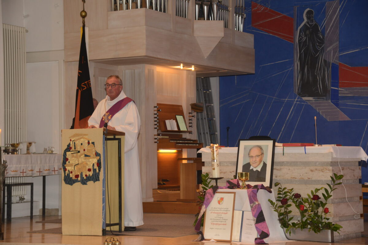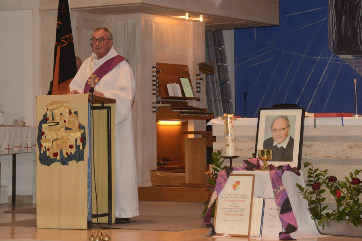 Pater Thomas Mühlberger begrüßte die große Trauergemeinde in der Stadtpfarrkirche, auch die zahlreichen Fahnenabordnungen der Vereine. Der Geistliche sprach das „Kommen und Gehen“ der Menschen an, das für Pater Reinhold Schmitt ein „ganz normaler“ Vorgang gewesen sei, und gedachte dann der Worte des heiligen Franz von Sales, worüber sich die Menschen eigentlich Sorgen machen: „Solange wir auf Erden sind, ist Gott bei uns, und wenn wir von der Erde gehen, sind wir bei ihm.“ Dieses „Gehen“ sei für Pater Schmitt ein ganz bewusster Vorgang gewesen, sagte Pater Mühlberger, was er als „Augenzeuge“ auch bestätigen könne. Ein persönlicher Lebenslauf Pater Reinhold Schmitts, gefunden in seinen Unterlagen, zeige aber, dass sich der Geistliche schon lange mit seinem Abschied beschäftigt habe.