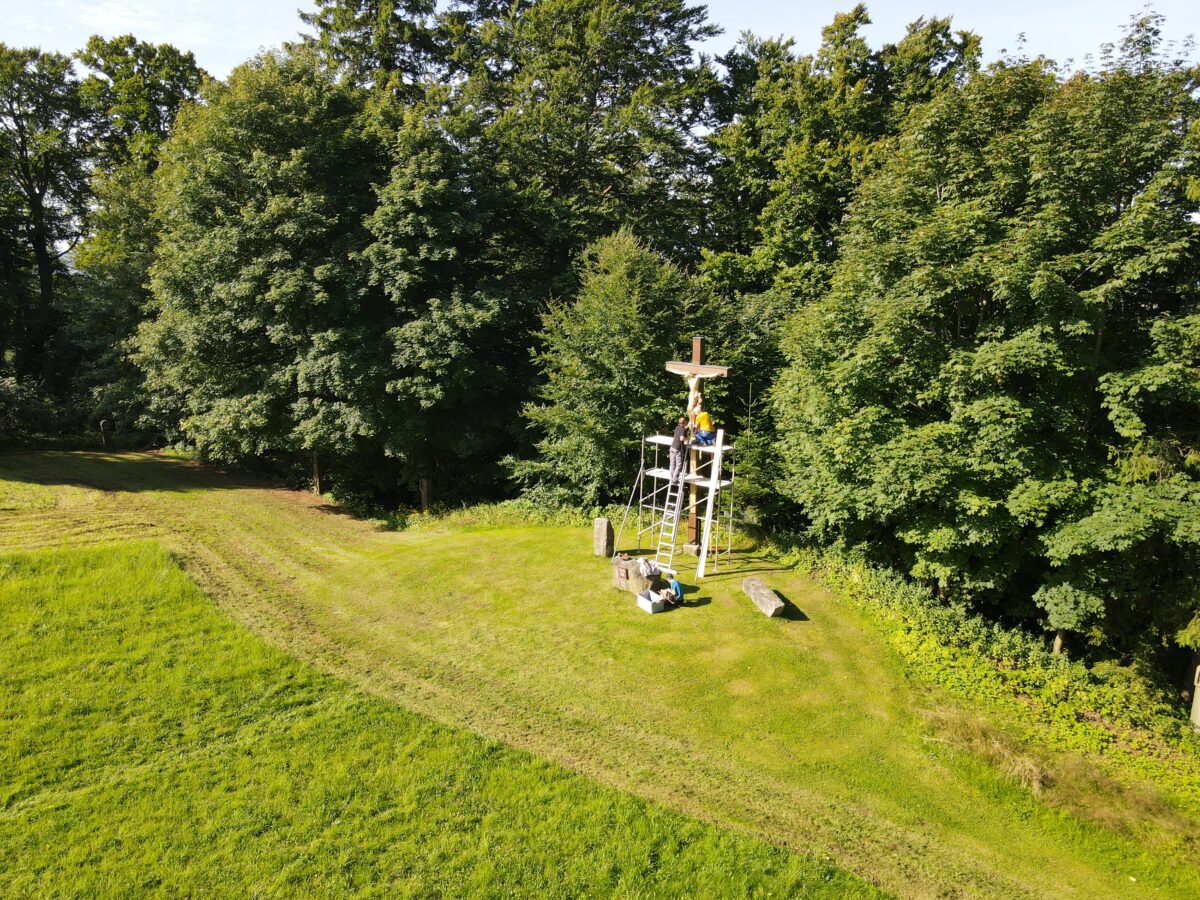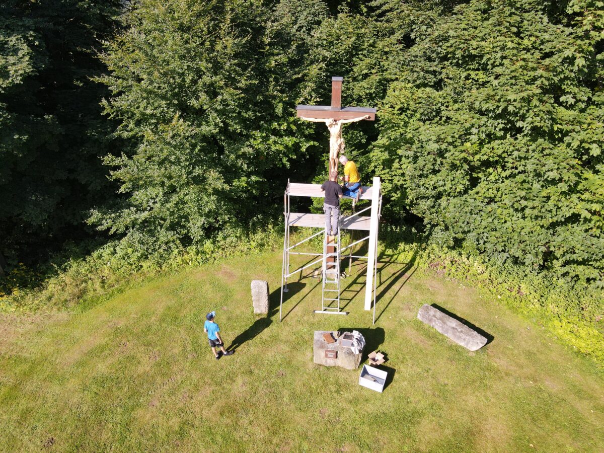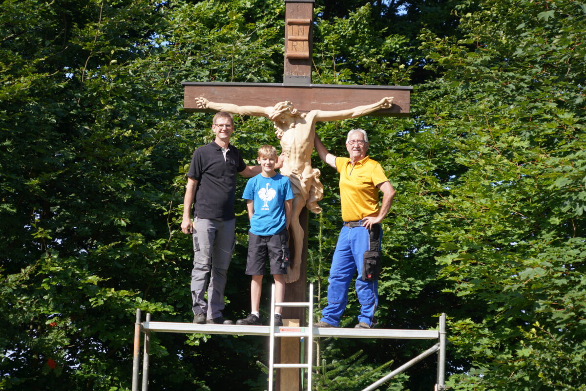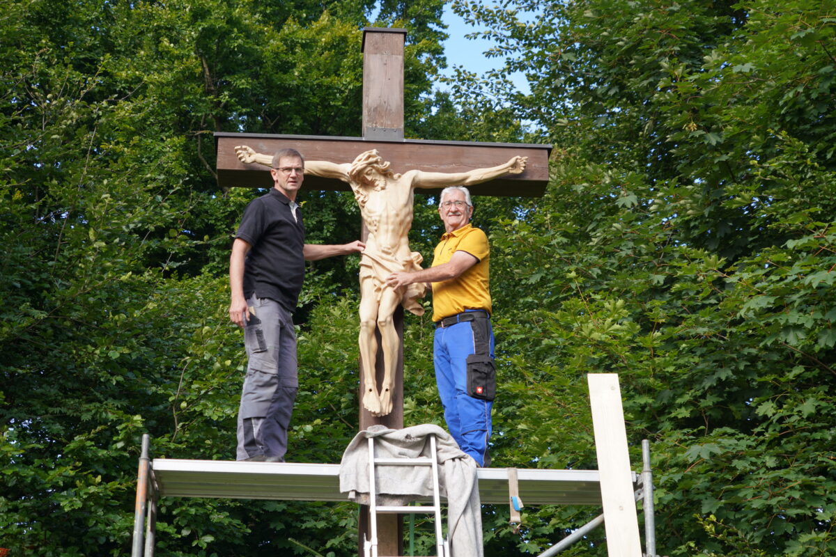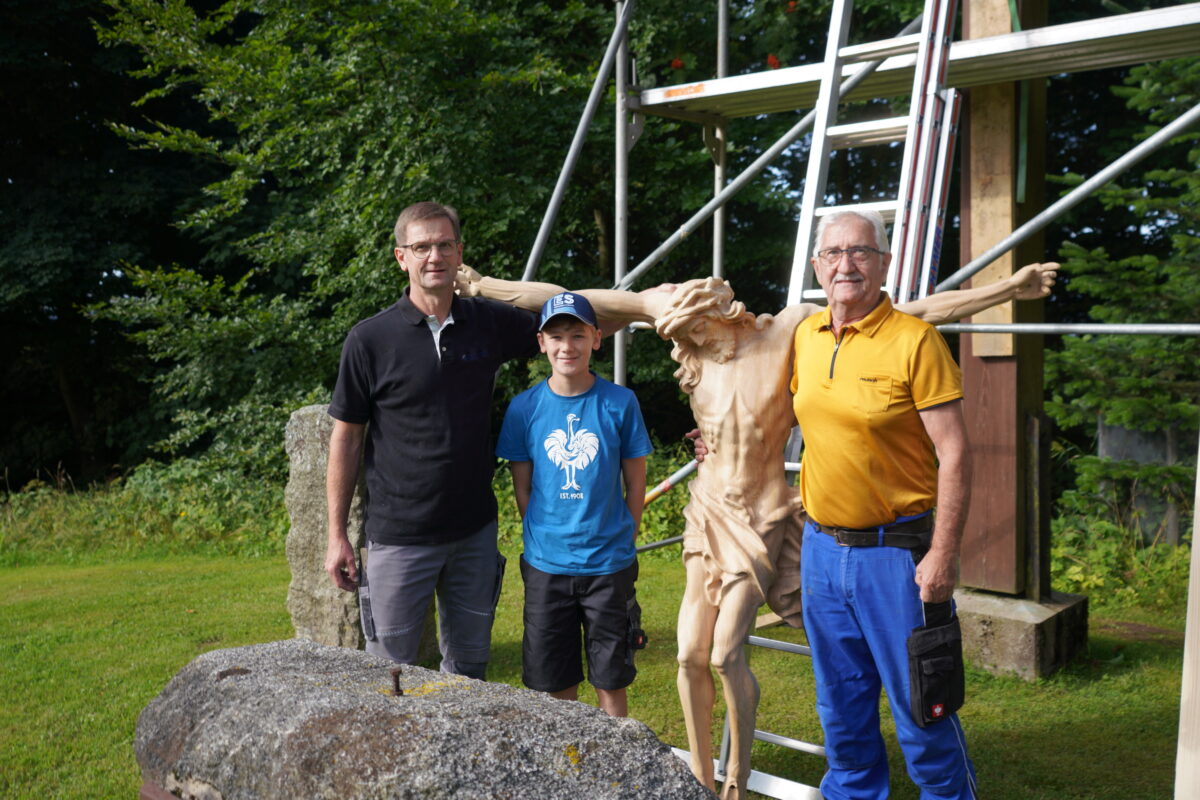 Auch der Waldthurner Pfarrer Norbert Götz war bei der Anbringung der nun neuen Figur anwesend. Am Großen Frauentag wird er den neuen Herrgott im Rahmen der feierlichen Wallfahrts-Festmesse segnen und so in das religiöse Leben auf dem Fahrenberg einführen.