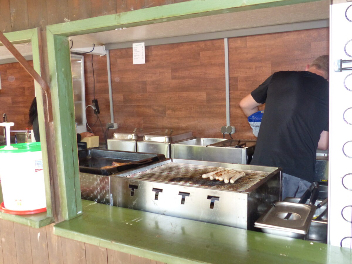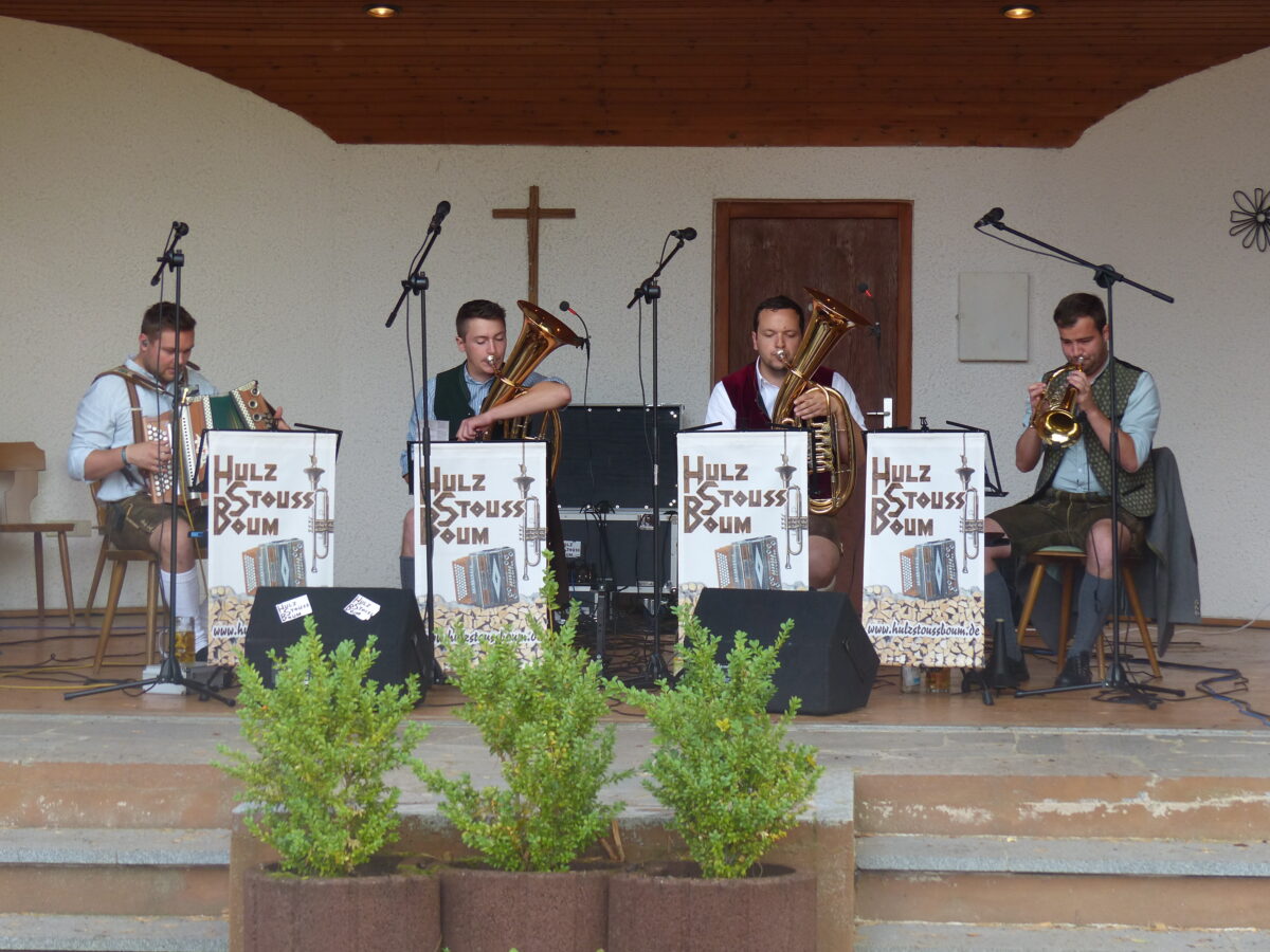 Der Gottesdienst am Sonntagvormittag zelebrierte Pfarrer Varghese Puthenchira im Biergarten des Blockhauses. Zum anschließenden Frühschoppen waren einige harte „Frühschopperer“ anwesend. Die Weißwürste schmeckten nicht nur dem Bürgermeister, auch der Pfarrer gönnte sich ein Paar. Die „Hulzstoußboum“, bestehend aus vier Burschen aus Waldthurn, bemühten sich Stimmung unter den Gästen zu verbreiten.