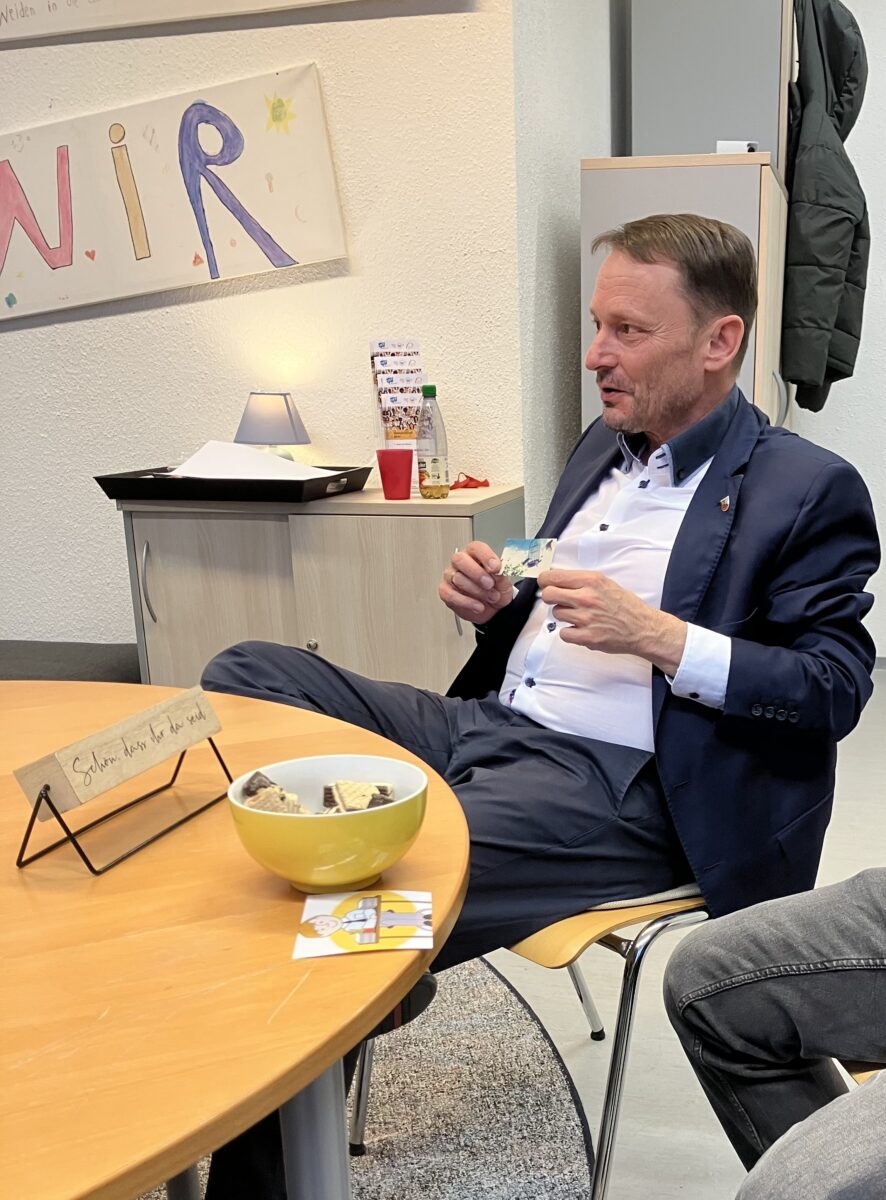 Die Gruppenstunde, die wöchentlich stattfindet, bietet den Teilnehmenden einen sicheren Raum, um sich mit ihren eigenen Werten auseinanderzusetzen und Erfahrungen zu teilen. Im Rahmen seines Besuchs hatte Oberbürgermeister Meyer die Gelegenheit, eigens erarbeitete Fragen der Jugendlichen zu beantworten.