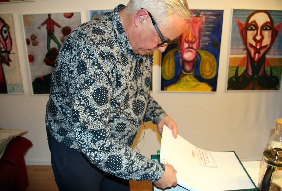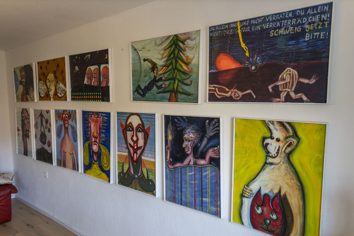 Was von außen unscheinbar wirkt, entpuppt sich innen als ein Museum der Huberschen Rock-Art. Hinter dem Esstisch leuchtet die ganze Wand mit einer doppelt gehängten Ahnengalerie farbenfroher Comicporträts. Fröhliche Teufel, ein fliegender feuerspuckeder Baumanzünder, neandertaleske doof aus der nicht vorhandenen Wäsche Gucker – es wird viel gezündelt und gebombt in diesem hinterkünftigen Panoptikum. Es ist auch eine Rückkehr in seine 68er-Jugend. „Als Jugendliche waren wir ständig in Hans Eibauers Red Egg“, schwärmt Huber von den wilden 70ern, in denen der umtriebige Eibauer die Hippies aus der ganzen Oberpfalz in seine Disco nahe des Eisernen Vorhangs lockte.