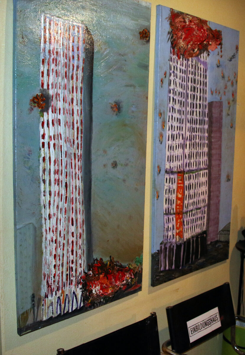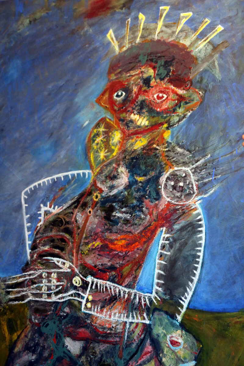 In der Wahrnehmung des Künstlers ist der General kein blutrünstiger Tyrann der Gegenwart. Eher ein Soldat alter Schule ausgebildet in der Kaderschmiede eines Carl von Clausewitz. Mit den Bildern des bombardierten Mariupols im Kopf formt mein Verstand daraus die hässliche Fratze des Krieges in Reinformat. Das dort auf dem fast mannshohen Gemälde vor Van-Gogh-nachtblauem Himmel ist jener Vladimir Putin, dem die Gestalt der Freiheit links im Bild sterbend die Maske vom Gesicht gerissen hat.