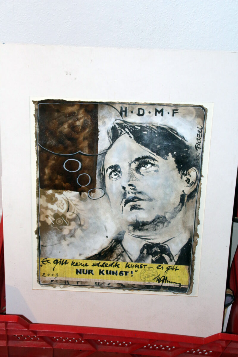 Apropos Bomben: Die Brutalität von Putins Krieg gegen die Ukraine beschäftigt natürlich auch Jürgen Huber. Im Keller überarbeitet er immer wieder den „General“, der sich wie die meisten seiner Motive selbst auf die Leinwand geschlichen hat. Unablässig sucht das menschliche Auge nach bekannten Mustern. In einer Farbstruktur erkennt es die Umrisse eines Gesichts, die Huber dann herausarbeitet. Und dort, ist das nicht ein Arm? Schon gesellt sich eine weiße Kontur dazu, die an eine napoleonische Uniform erinnert.