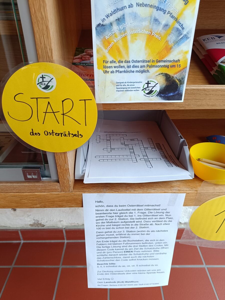 Beginnend am Nebeneingang der Kirche führte die Strecke durch Waldthurn bis zum Kinderwagenhäuschen an der Kindertagesstätte St. Josef. An insgesamt 14 Stationen waren Fragen mit religiösem Bezug rund um Ostern zu Beantworten. Aus den richtigen Antworten ergab sich demnach der Zahlencode, der die Schatztruhe öffnete und man sich einen kleinen Preis aussuchen durfte. Vor Ort gab es dann zudem wieder die Möglichkeit, sich auf einem Zettel mit der Aufschrift „Ich war dabei“ einzutragen.