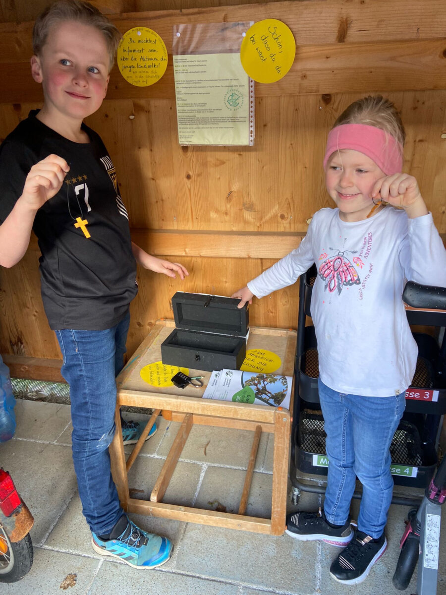 Dort musste man den Lösungcode an der Schatztruhe eingeben. Zuvor musste man Fragen rund um Ostern beantworten, wie zum Beispiel, auf welchem Tier Jesus beim Einzug am Palmsonntag in Jerusalem saß, womit die Leute wedelten oder auch nach Symbolen und Bräuchen von Ostern wurde gefragt.