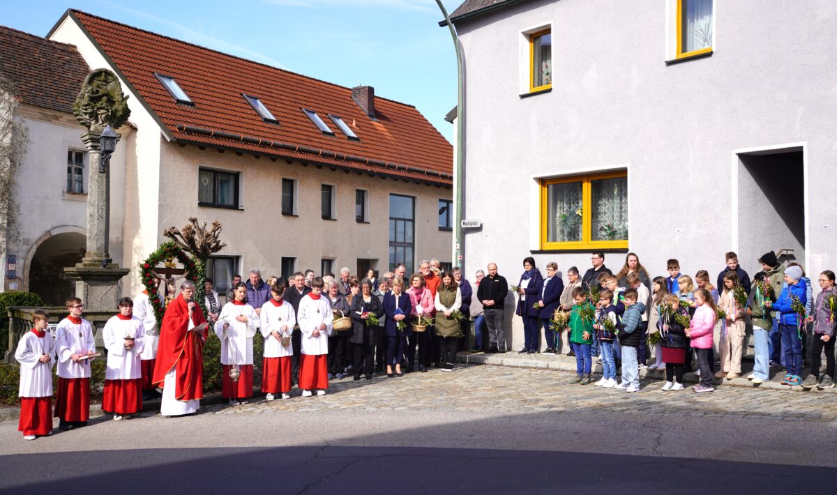 Pfarrer Norbert Götz segnete die Palmbuschen, bevor sich zahlreiche Gläubige in einer festlichen Prozession auf den Weg zur Pfarrkirche machten. Dort wurde im Anschluss die Heilige Messe gefeiert.