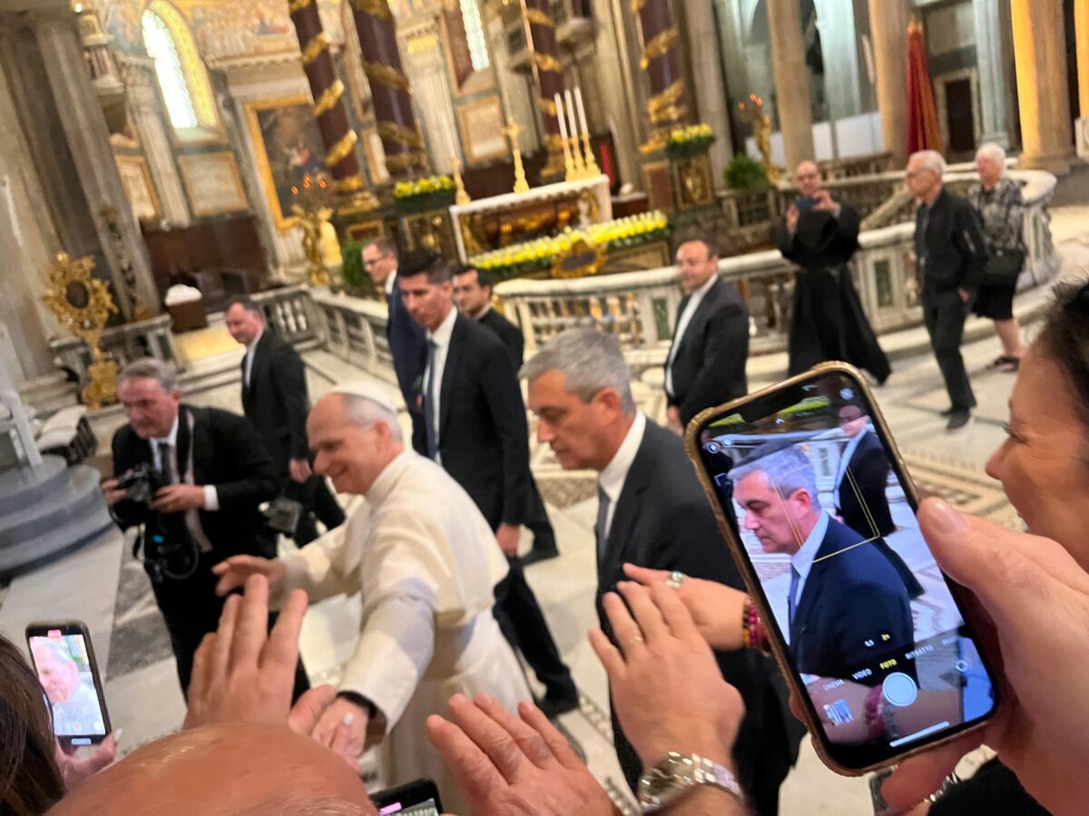 Gerald und Gisela Morgenstern warten noch einmal eine Dreiviertelstunde, ehe sie erst durch einen Detektor, dann durch die Heilige Pforte treten dürfen. Die Besucher werden am Grabstein vorbeigeleitet und können dann in den Kirchenbänken noch zum Gebet verweilen. Das tun auch die beiden Oberpfälzer, bis nach etwa zehn Minuten eine Art Tumult ausbricht. Rufe werden laut: “Papa Leone! Papa! Papa Leone!”. “Meine Frau sagt zu mir: Jetzt kommt der Papst.”