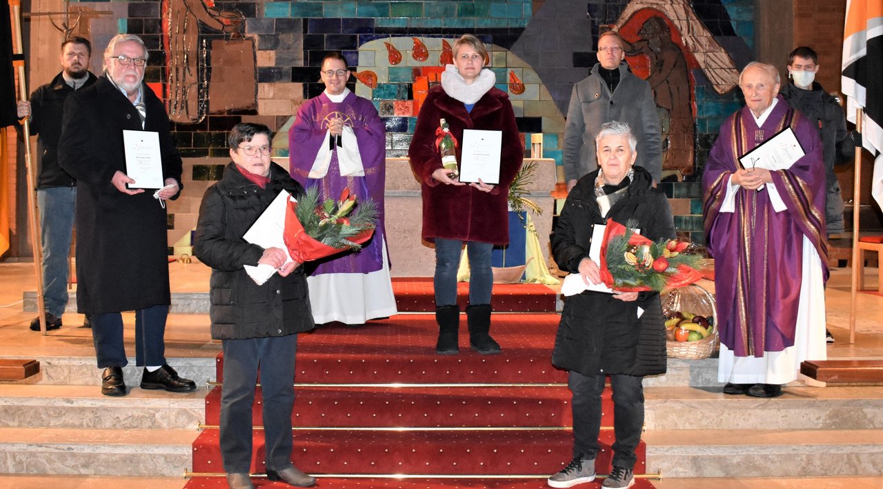 Nach Beendigung des Gottesdienstes sind langjährige Kolping-Mitglieder geehrt worden. Dies waren Katrin Herold und Stefan Schultes für 25 Jahre. Für 40 Jahre wurde Pfarrer Hans Bayer geehrt. Er war der ehemalige und langjährige Präses der Kolpingsfamilie und während seiner Zeit als Stadtpfarrer in Grafenwöhr begeisterte er damals in der Kolpingjugend den jetzigen Kolpingvorsitzenden.