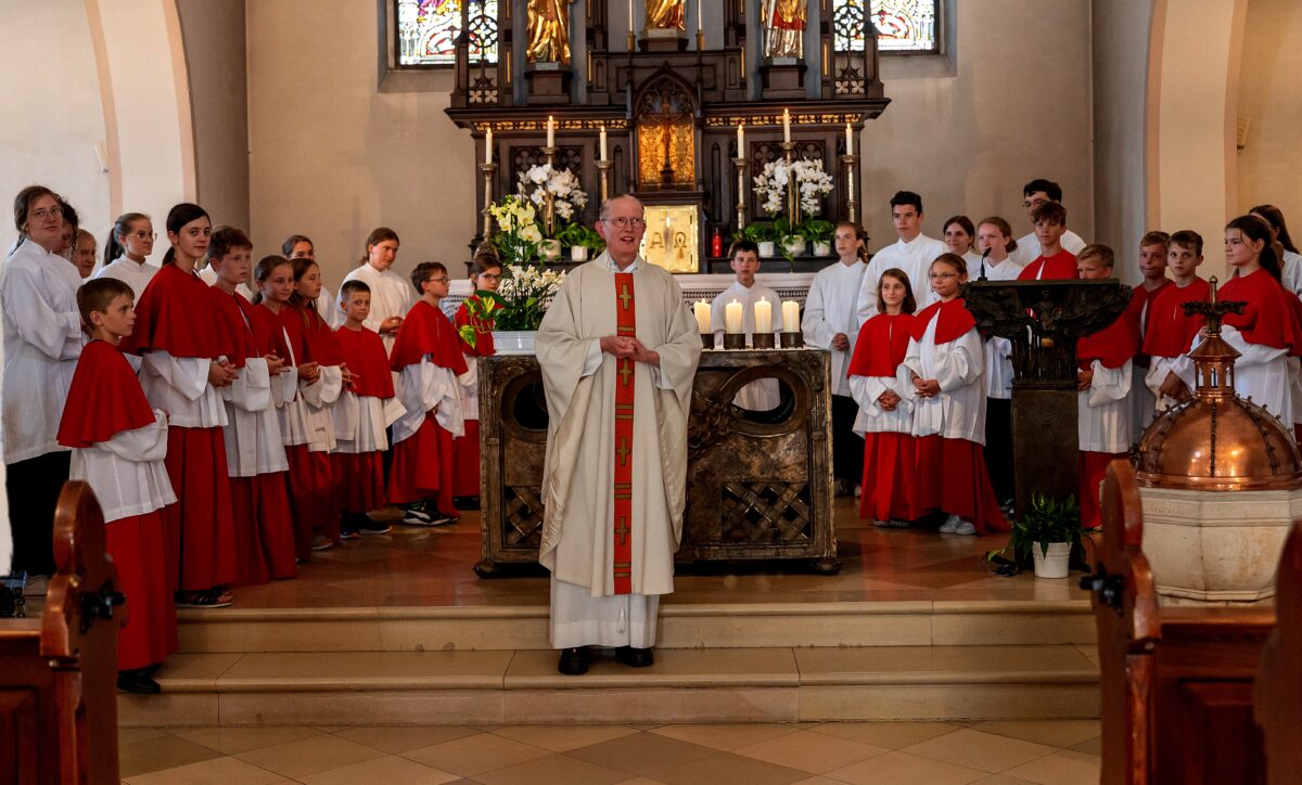 Pfarrer Heller freute sich über die vielen Ministranten, die ihm die Ehre gaben und kamen, um den Abendgottesdienst mitzugestalten. Die musikalische Umrahmung stellte der Kirchenchor, unter Leitung von Organist Markus Bäumler zusammen. Pfarrgemeinderatssprecher Jörg Frenzel gratulierte nach dem festlichen Gottesdienst im Namen der Pfarreiengemeinschaft am Kirchenplatz vor der Kirche und überreichte ein