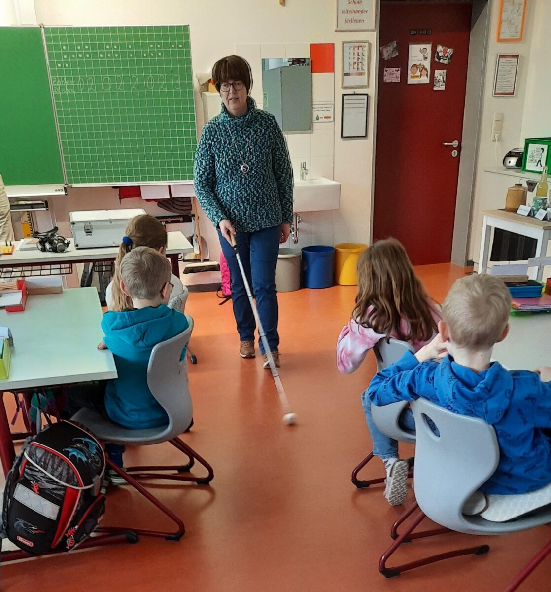 Sie zeigte, wie sie mit ihrem weißen Taststock, mit einer Kunststoffkugel daran, sicher durch das Klassenzimmer kommt, sogar enge Stellen passierte sie. Außerdem erzählte sie, wie sie die Uhr abliest und dass sie auch Fahrrad fahren kann. Dazu braucht sie allerdings einen Tandempartner. Blinden-Punkte-Schrift (Braille) wurde an die Schultafel gemalt.