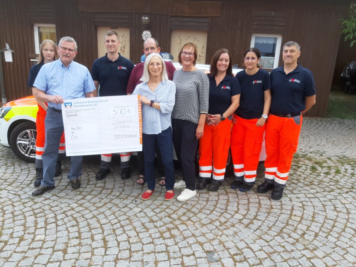 Zur Scheckübergabe vor dem Siedlerheim war HvO-Leiter Philipp Mangold aus Mantel mit seiner Stellvertreterin Carmen Stubenvoll, Stefan Lippik, Daniela Banzer und Lena Bock mit dem neuen Einsatzfahrzeug nach Etzenricht gekommen. Aufgabe der ehrenamtlichen Helfer vor Ort ist es, durch die kürzere Anfahrt im Notfall die Zeit bis zum Eintreffen des Rettungsdienstes zu überbrücken. Sie übernehmen die Versorgung und Betreuung der Patienten und können auch lebensrettende Sofortmaßnahmen wie die Herz-Lungen-Wiederbelebung durchführen. Alarmiert von der Rettungsleitstelle, kommt ihnen eine wichtige Funktion in der Rettungskette zu.