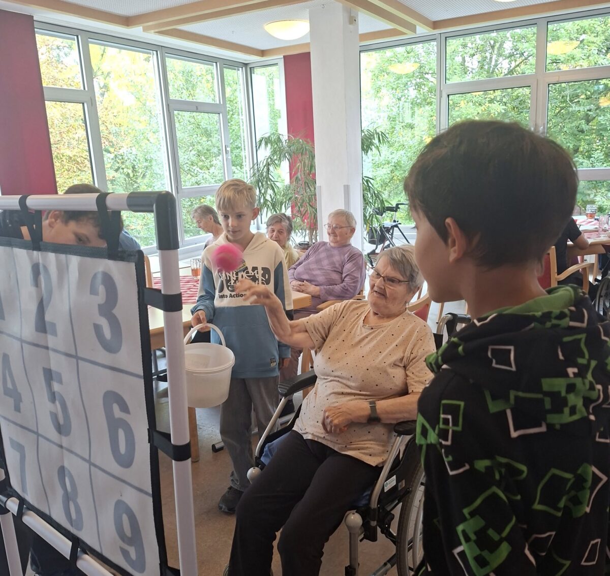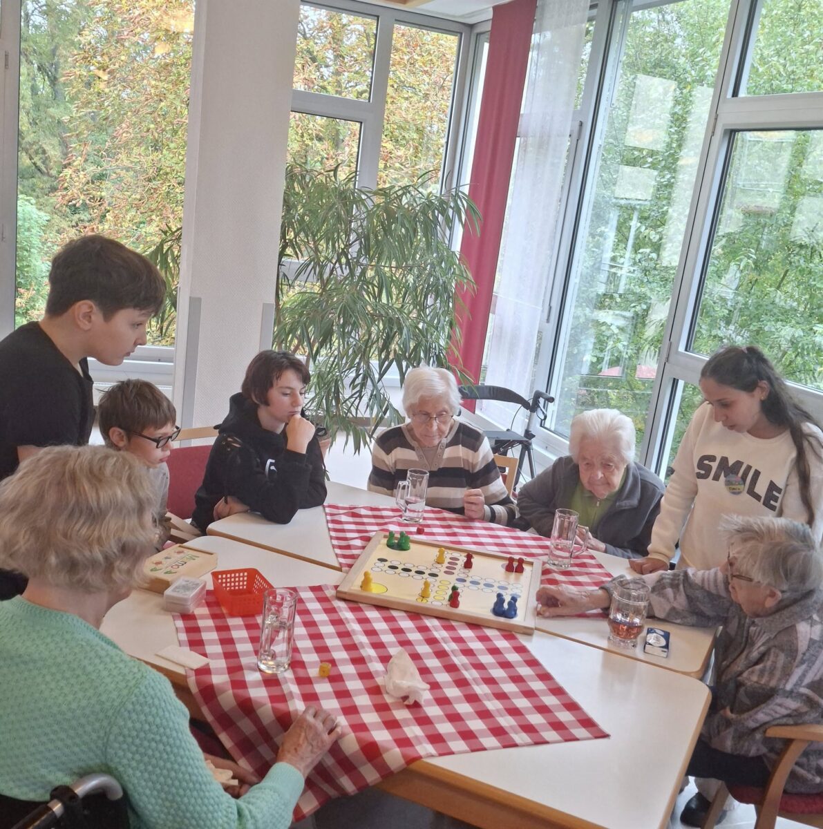 Jeden zweiten Mittwochvormittag besuchen Schülerinnen und Schüler der 6. Klasse die Bewohnerinnen und Bewohner der Einrichtung, um gemeinsam Zeit zu verbringen – beim Spielen, Vorlesen oder einfach im Gespräch.