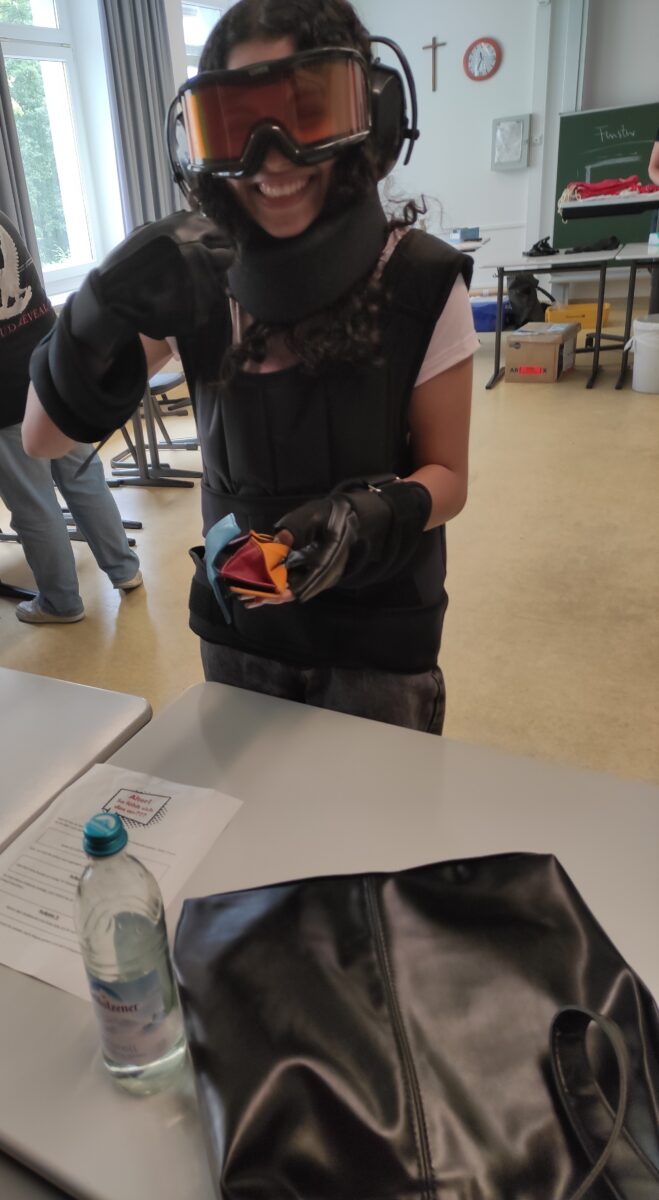 Neben dem medizinischen Teil standen auch die Veränderungen im Alter im Mittelpunkt. Daniela Schwarz schilderte anschaulich typische Beschwerden wie Schwerhörigkeit oder Gelenkprobleme, aber auch soziale Herausforderungen wie Einsamkeit. Für viele Aha-Momente sorgte der Alterssimulationsanzug „GERT“: Mit Gewichtsmanschetten, speziellen Brillen und eingeschränkter Beweglichkeit erfuhren die Schülerinnen und Schüler am eigenen Körper, wie beschwerlich alltägliche Dinge im Alter sein können – vom Schuhe binden bis zum Bezahlen an der Kasse.
