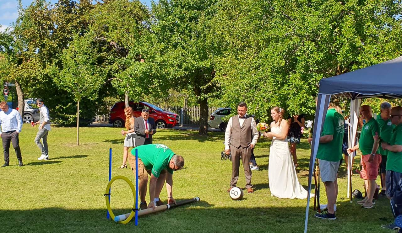 Den Hochzeitstag der Teamleiterin (30) beim Online-Reisebüro Nix-wie-weg und dem Monteur (33) bei Siemens wollten natürlich auch Arbeits- und Vereinskollegen zu etwas besonderem werden lassen. Für Glückwünsche, Spalier und Spiele hatten sich alle mächtig ins Zeug gelegt.