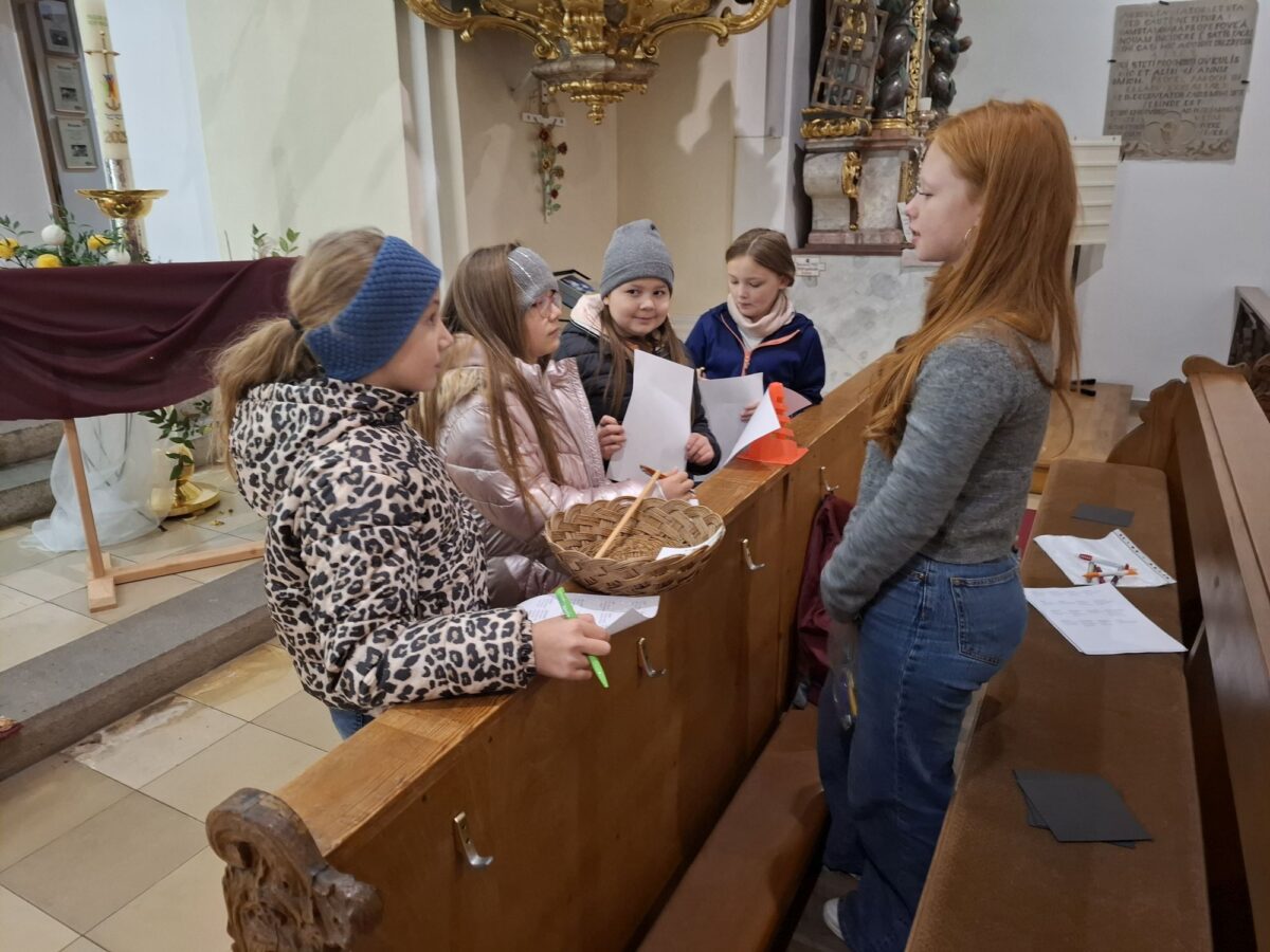 Es galt, ein Kreuzworträtsel, ein Puzzle zu lösen, das Martinslied im Chor zu präsentieren und eine Martinslaterne zu basteln. Alle gebastelten Martinslaternen wurden zum Abschluss vorne am Altarraum bei der Osterkerze in einer Halterung aufgestellt.