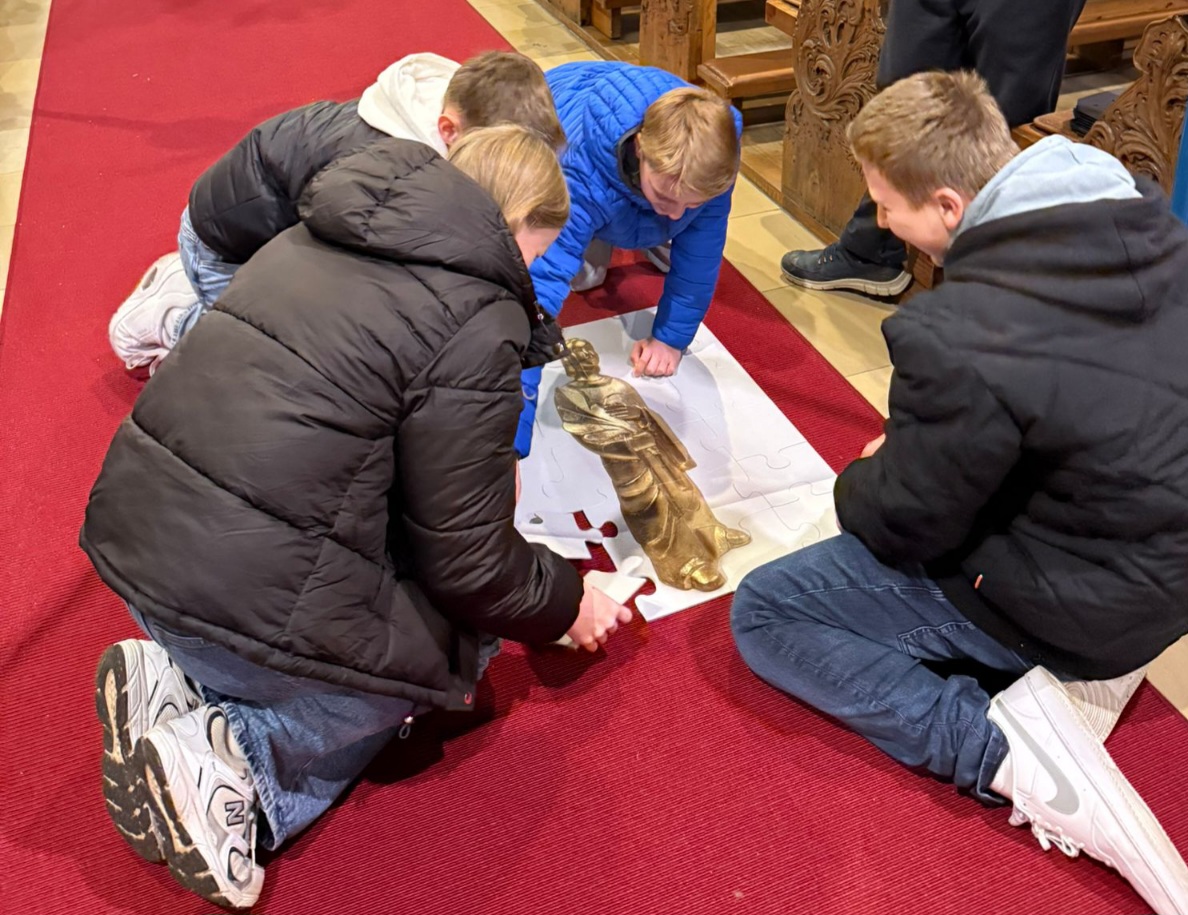 Im Anschluss füllten die Gottesdiener mit Unterstützung einiger Eltern und Oberminis die Kirche spielerisch mit einer „St.-Martins-Rallye“. An insgesamt sieben Stationen konnten die Kinder und Jugendlichen in gemischten Teams ihren Teamgeist und ihr Wissen unter Beweis stellen und dabei gleichzeitig die Kirche und ihre Heiligen (wie zum Beispiel die Heiligen Tarcisius und Florian) näher kennenlernen. Aber auch das ewige Licht, die Madonna im Rosenkranz und die Ausrüstung des Soldaten Martins standen im Mittelpunkt.