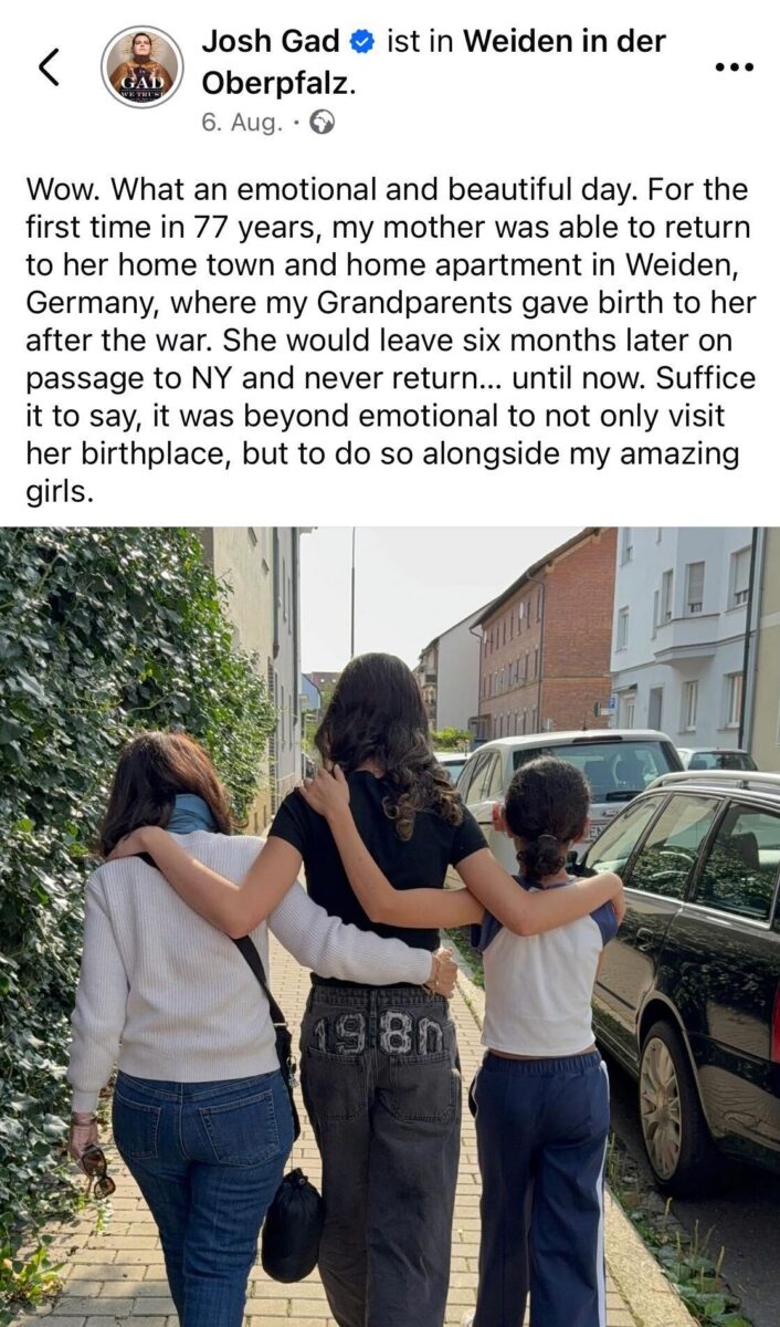 Den Hintergrund erklärt er selbst: “Wow! Was für ein emotionaler und wunderschöner Tag! Zum ersten Mal seit 77 Jahren konnte meine Mutter in ihre Heimatstadt und ihre Wohnung in Weiden, Deutschland, zurückkehren, wo meine Großeltern sie nach dem Krieg zur Welt gebracht hatten. Sechs Monate später reiste sie nach New York ab und kehrte nie wieder zurück … bis jetzt. Es war einfach unglaublich emotional, nicht nur ihren Geburtsort zu besuchen, sondern dies auch noch zusammen mit meinen wunderbaren Töchtern zu tun.”