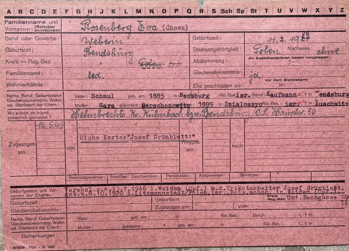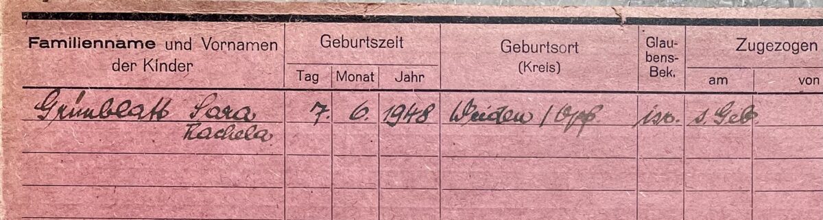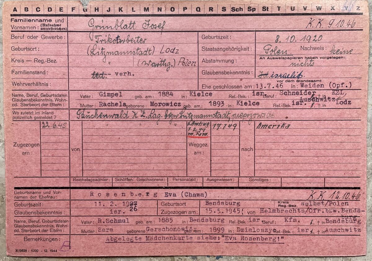 Hintergrund: Seine Großeltern, aschkenasische Juden aus Polen, strandeten nach Ende des Zweiten Weltkriegs als “Displaced Persons” in Weiden. Josef Grünblatt, geboren 1919 in Lodz, hatte die Konzentrationslager Auschwitz und Buchenwald überlebt. Seine Frau Eva Rosenberg (geboren in Bendsburg/Będzin) kam aus Helmbrechts nach Weiden, wo sich ein KZ-Außenlager von Flossenbürg befand.