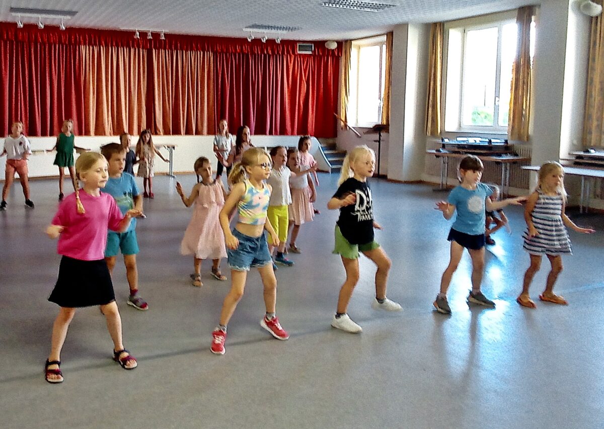 Die “Dance Party” wurde im Pfarrsaal von Schirmitz abgehalten, wo reichlich Platz für Tanz und Spiel zur Verfügung stand. Interessanterweise zog diese Veranstaltung nicht nur Mädchen an; auch zwei Jungen nahmen teil und zeigten ebenso Begeisterung daran, die Tanzbewegungen zu lernen. Ina Lenk führte die Gruppe zuerst in einfachere Schritte ein und ließ die Komplexität der Choreografien und die Geschwindigkeit der Musik stetig steigen. Trotz der zunehmenden Herausforderung hielt jedes Kind mit Freude mit und genoss die dynamische Bewegung zur Musik.