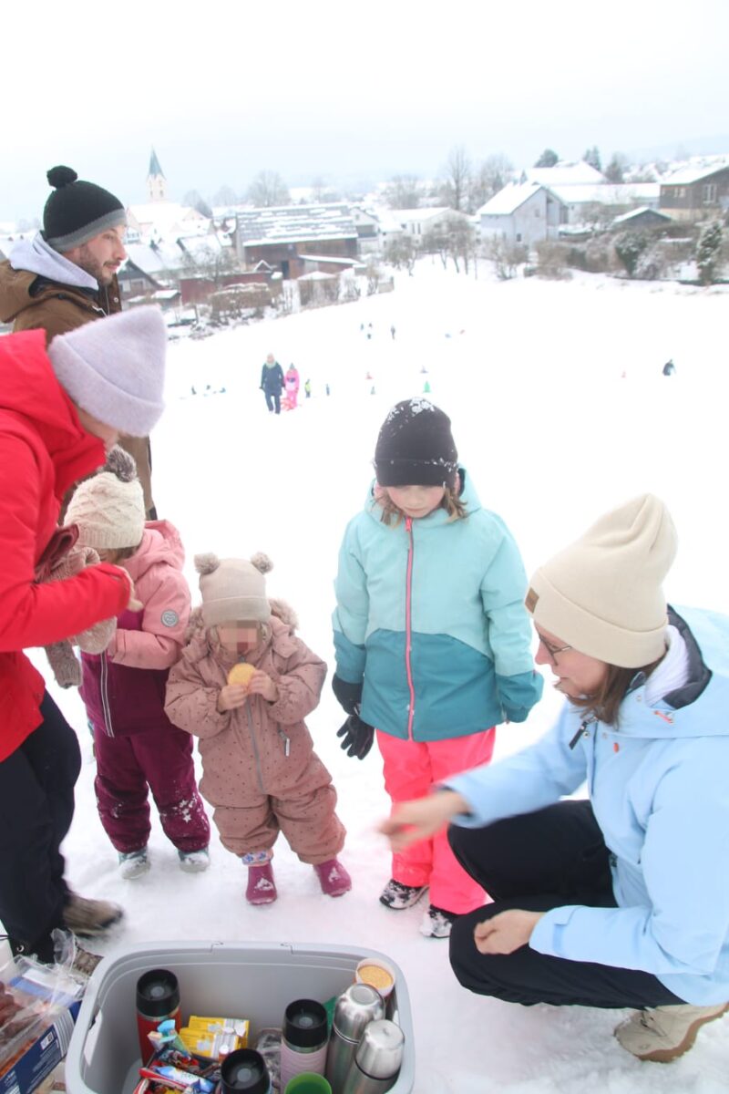Rund 25 Kinder und ebenso viele Erwachsene nahmen zunächst teil, im Laufe des Nachmittags schlossen sich immer wieder weitere Familien an. Das Alter der Kinder reichte dabei vom Kleinkindalter bis hin zu etwa zwölf Jahren. Besonders auffällig war das harmonische Miteinander. Während die Kinder begeistert den Hang hinabsausten, nutzten die Erwachsenen die Zeit für Gespräche, Begegnungen und gemeinsames Beobachten des bunten Treibens.