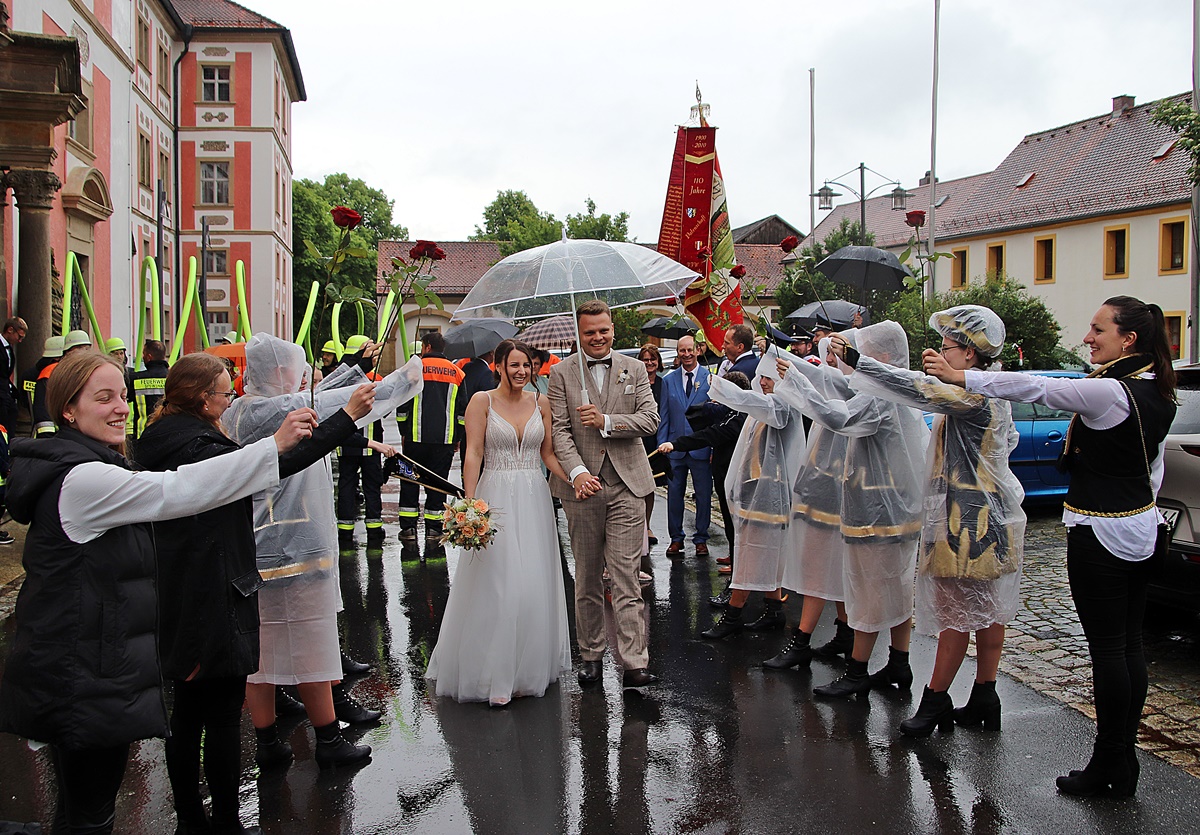 Um 13.30 Uhr trat das Paar aus der Klosterkirche in Speinshart und kurz darauf hörte es auf zu regnen. „Ein gutes Zeichen“, so ein Hochzeitsgast. Bereits am 4. April 2024 hatten sich die 25-jährige Anna Seitz, geb. Thaller aus Schlammersdorf und Philipp Seitz (noch 26) aus Zettlitz standesamtlich getraut, ehe es nun am Samstag zur kirchlichen Hochzeit kam.
