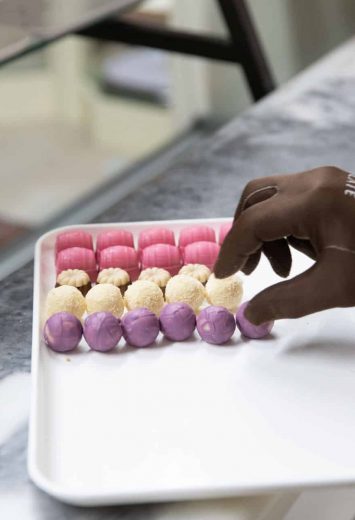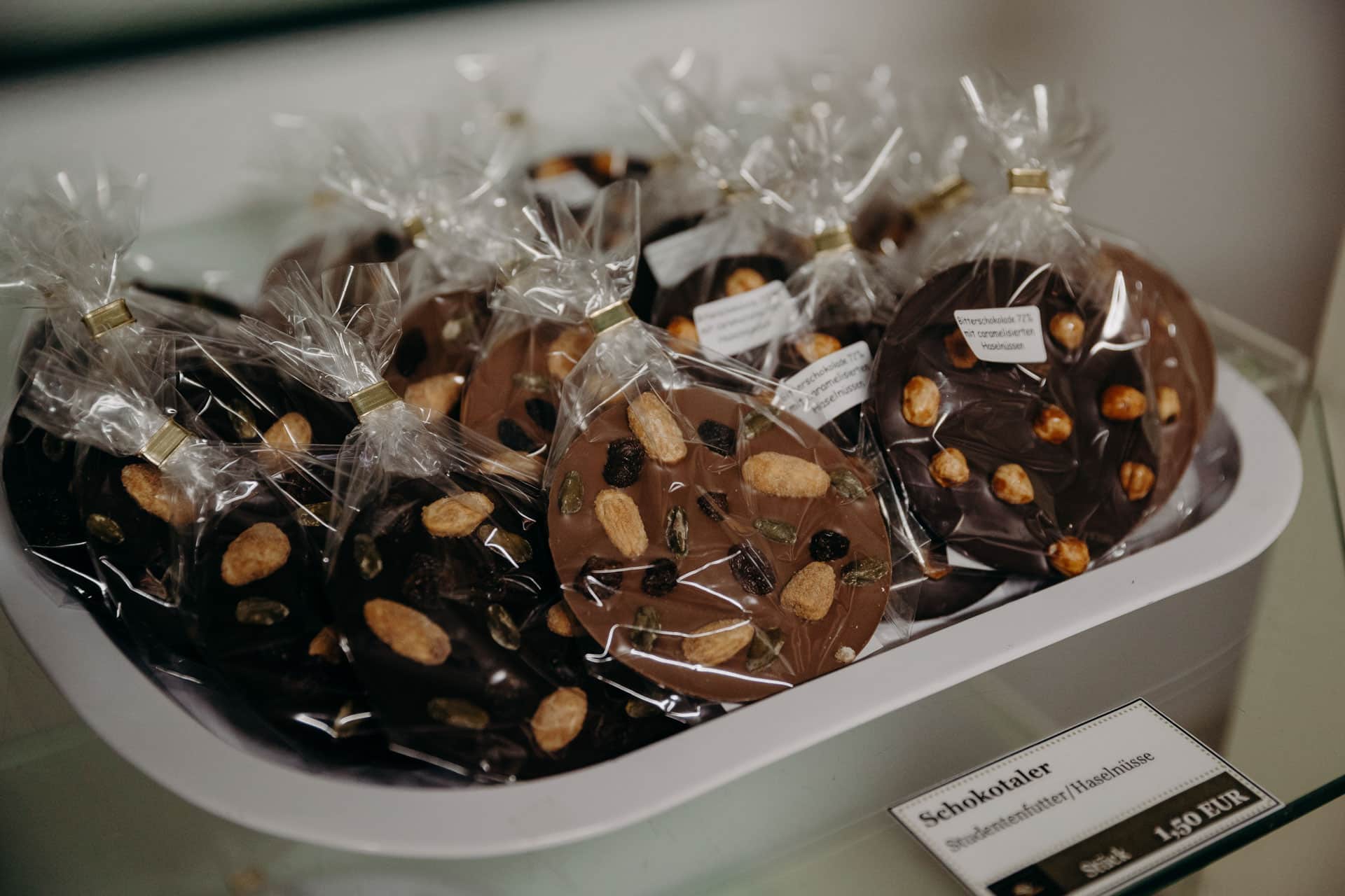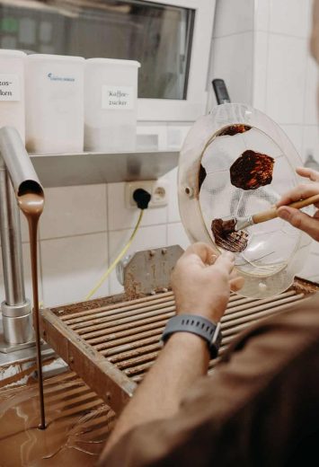 Die richtige Temperatur der Schokolade ist ganz entscheidend. Ist sie zu warm, wird sie nicht fest, ist sie zu kalt, wird sie grau“, gibt uns der Konditor einen Einblick in sein Handwerk. „Die besseren Geschmacksknospen allerdings hat meine Ehefrau und ich bin auch sehr glücklich, dass sie sich um die ganzen Verpackungen kümmert“, erzählt Markus weiter.