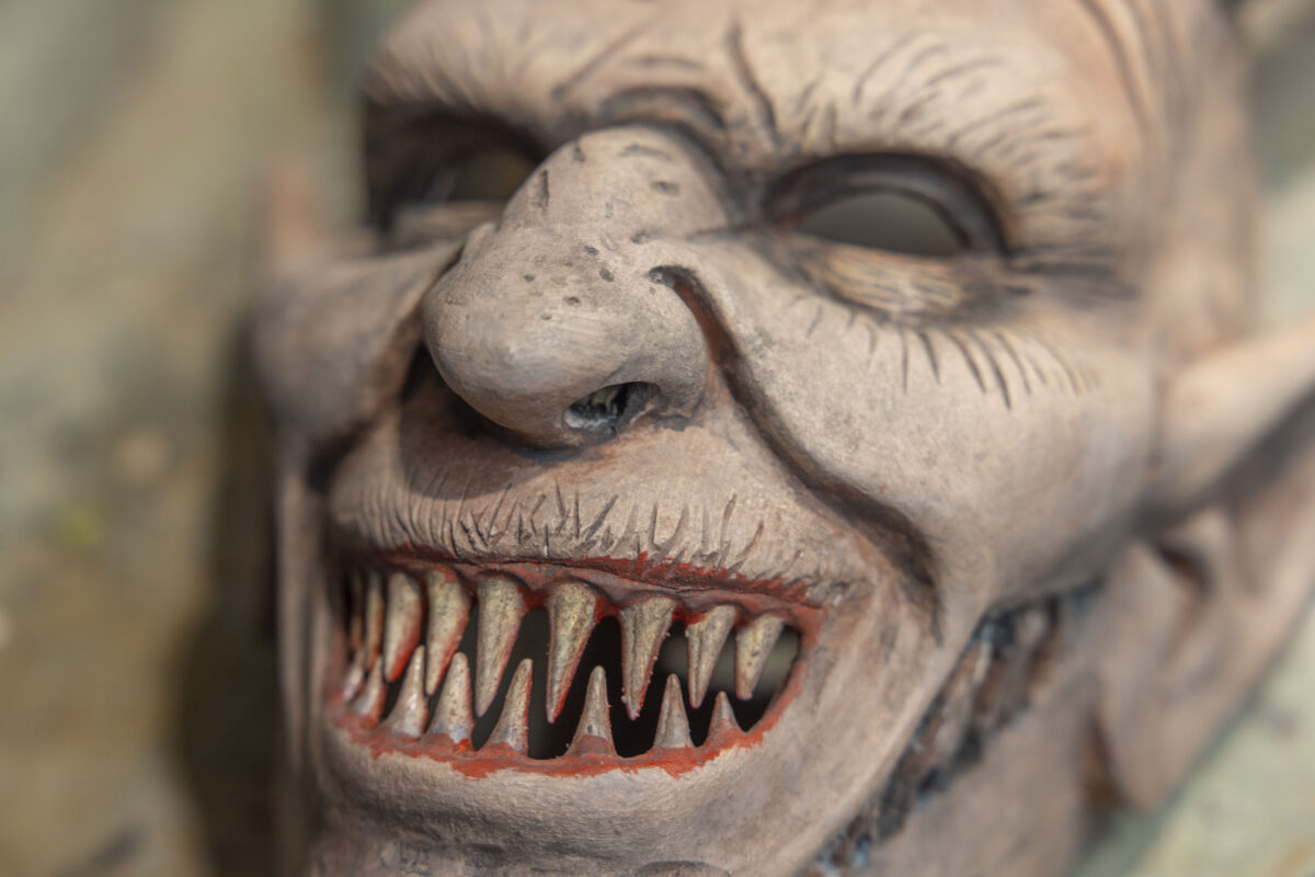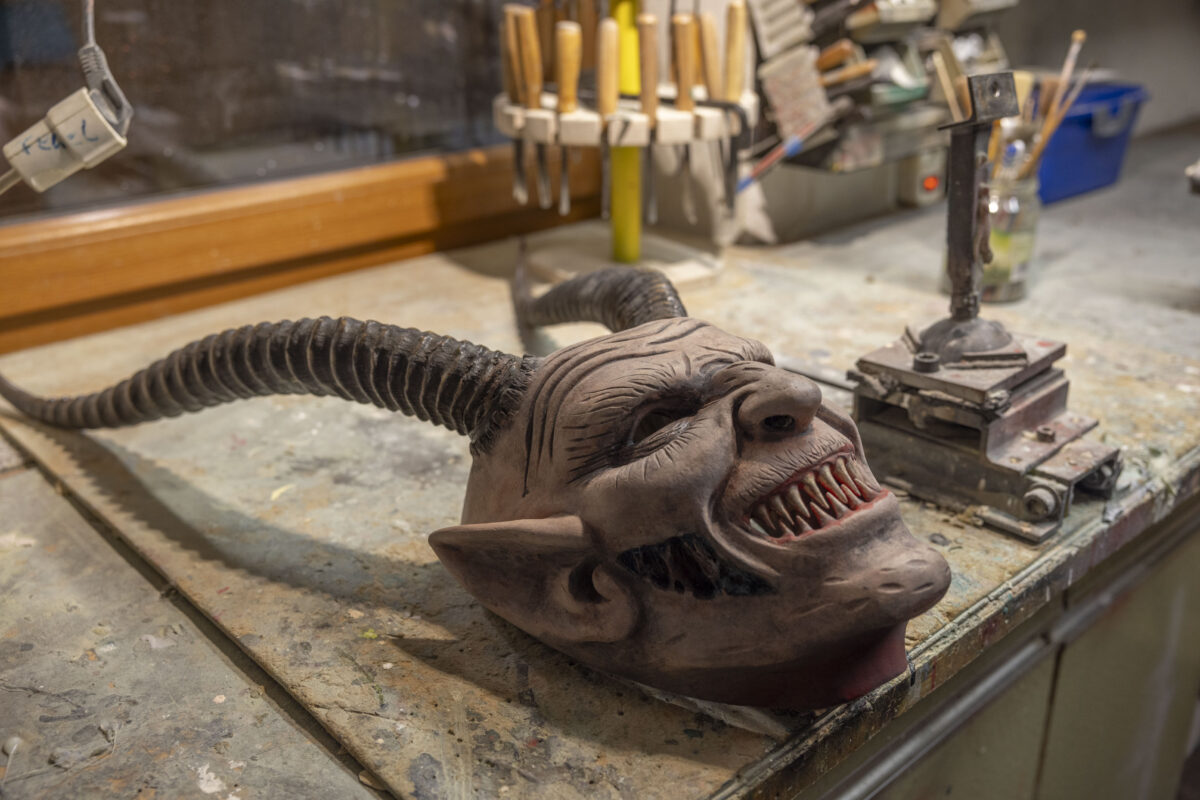 Ist die Maske fertig, wird weiter “veredelt”. Hörner dürfen bei der Teufelsversion nicht fehlen. Windschügl verwendet Echthorn, wie Antilope, Ziege oder Schaf. Die gäbe es auch in Kunststoff und würden sogar nur einen Bruchteil kosten. Das ist aber nix für den Flossenbürger. “Wenn schon, dann soll es echt sein”, findet er. Danach sind die Augen dran. Windschügl gießt sie aus Glas und Epoxitharz. Die werden von hinten in die Maske reingesteckt. Sie können beleuchtet werden. Ein stechend roter oder giftgrüner Blick in dunkler Nacht – das steigert den Gänsehauteffekt. So eine Gruselmaske braucht natürlich Haare. Auch hier verarbeitet Windschügl nur Echtes, vom Pferde, der Ziege oder vom Yak. 40 gegerbte Pferdeschwänze hängen bei ihm auf Vorrat.