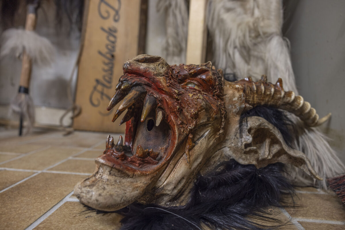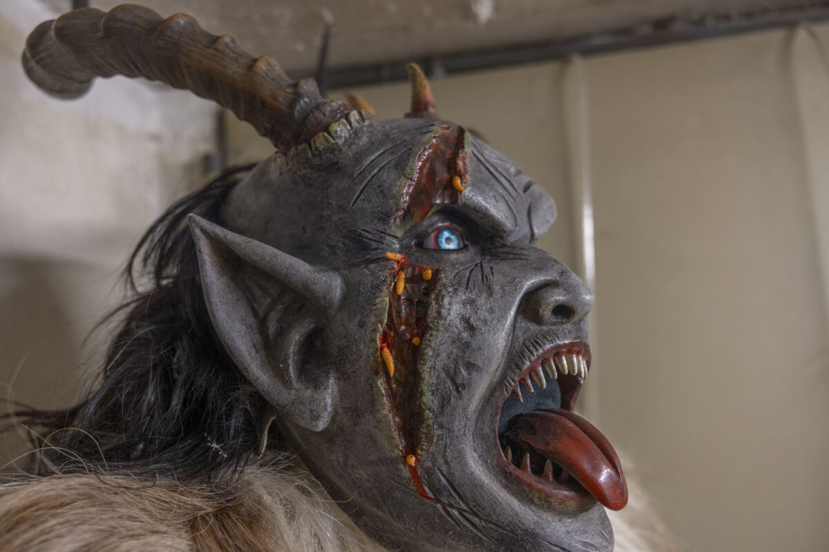 Viel Zeit verbringt der Werkzeugmacher in seiner Werkstatt im Keller. Und Zeit braucht es auch, bis so eine schaurig schöne Holzfratze fertig. 60 Stunden schnitzt er an einem Exemplar. Windschügl arbeitet ohne Vorlagen. “Die Gesichter entstehen bei mir im Kopf”, lacht er. Los geht es mit einem Holzblock aus Zirbe oder Weymouthkiefer. Weichholz muss es eben sein. Augen, Mund und Nase werden zunächst definiert. Mit einer Motorsäge werden die groben Konturen herausgearbeitet. Dann werden die Schnitzmesser gezückt …