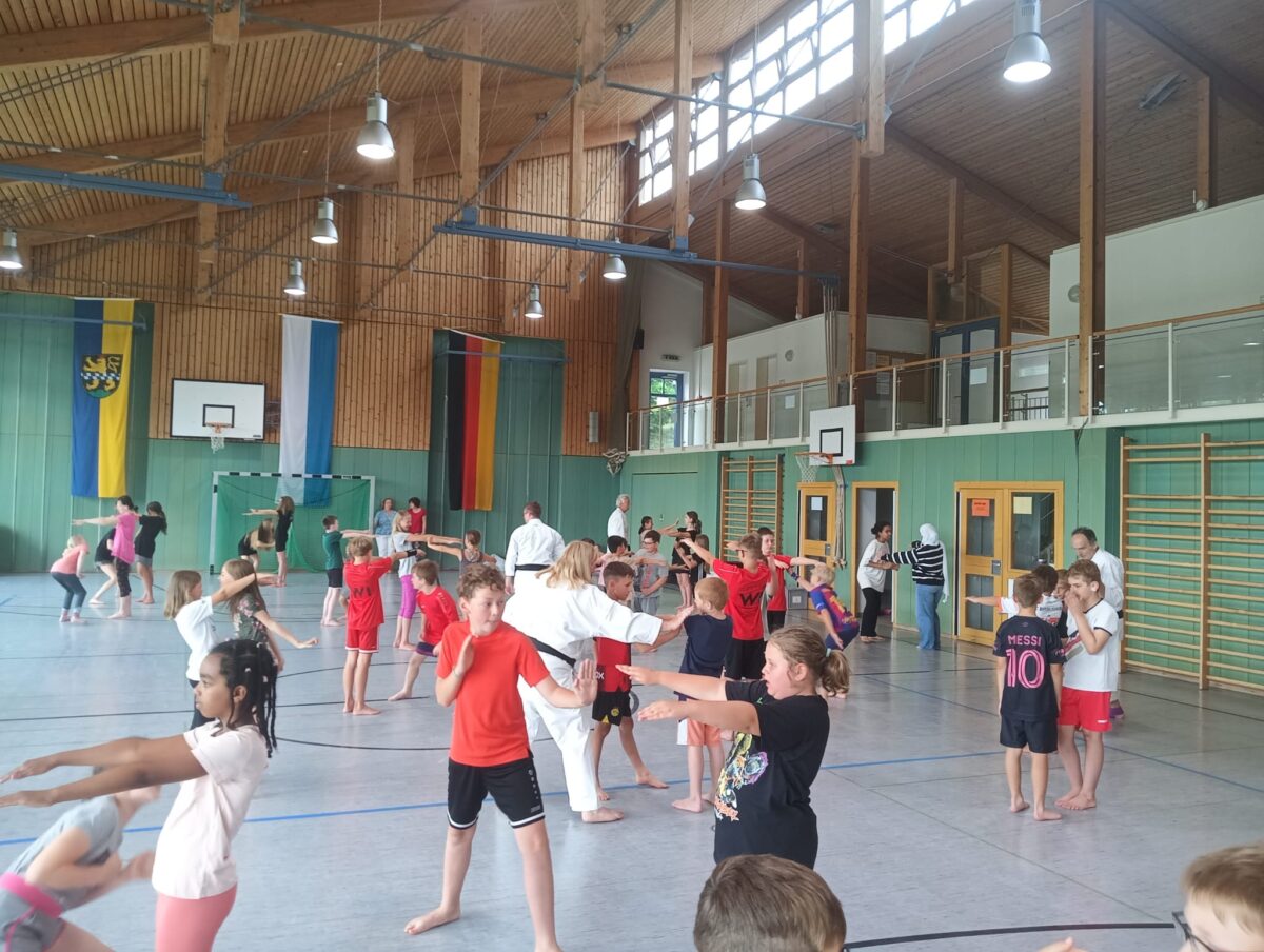 Dieses Mal waren nicht nur die Inhalte des Kurses außergewöhnlich, sondern auch die damit verbundenen Dimensionen. Nahezu 200 Schülerinnen und Schüler aus den benachbarten Schulen Georgenberg, Waidhaus und Pleystein tummelten sich von 7.30 bis 13 Uhr auf dem Gelände der Zottbachtal Grund- und Mittelschule. Die Veranstaltung wurde maßgeblich von Katja Gieler, Lehrerin an der Zottbachtal Grund- und Mittelschule Pleystein und selbst Mitglied des Karate Dojos Vohenstrauß, initiiert. Die Durchführung übernahmen der erfahrene Sensei Marcel Bieber und sein Trainerteam, bestehend aus Anna Horn, Josef Reichenberger und Peter Riedl.