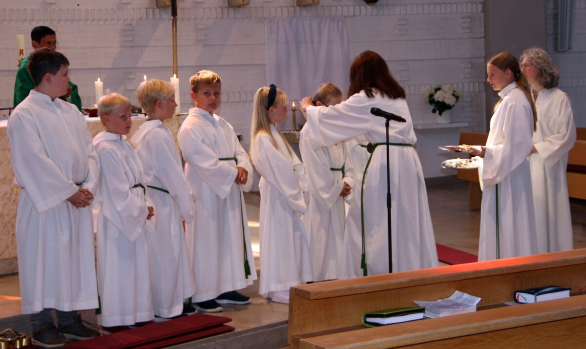 Danach wurden die Kreuze für die neuen Altardiener gesegnet und Oberministrantin Gläser hängte jedem das Kreuz um, und begrüßte alle mit Handschlag persönlich. Die Ministrantinnen und Ministranten unterstützen den Priester während der Messe, tragen Kerzen, helfen beim Gabenbereich und bei anderen liturgischen Aufgaben.