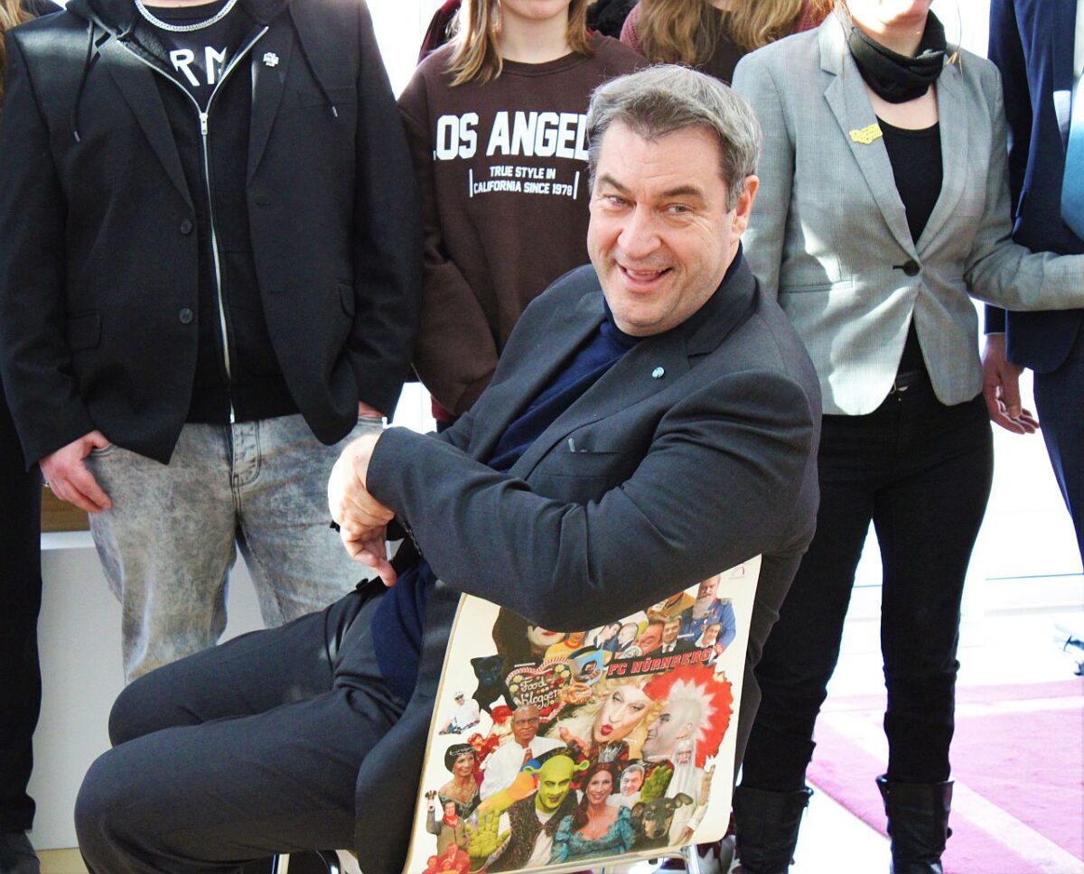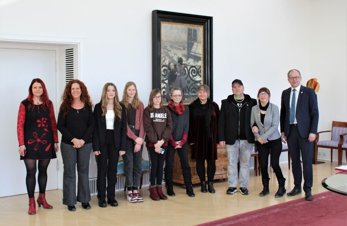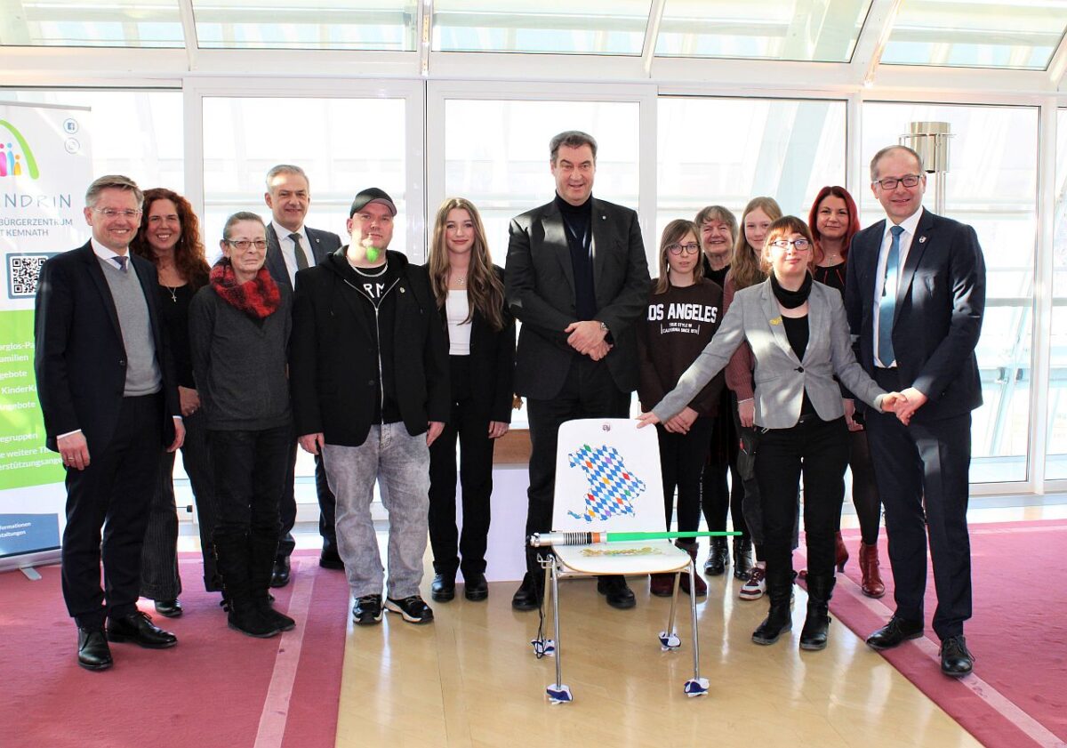 Eine Delegation des Familien- und Bürgerzentrums Mittendrin reiste für die Übergabe zusammen mit den Künstlern des Bayreuther Ateliers „Rote Katze“ nach München in die Staatskanzlei. Dort wurden die Besucher im Arbeitszimmer des Ministerpräsidenten empfangen.