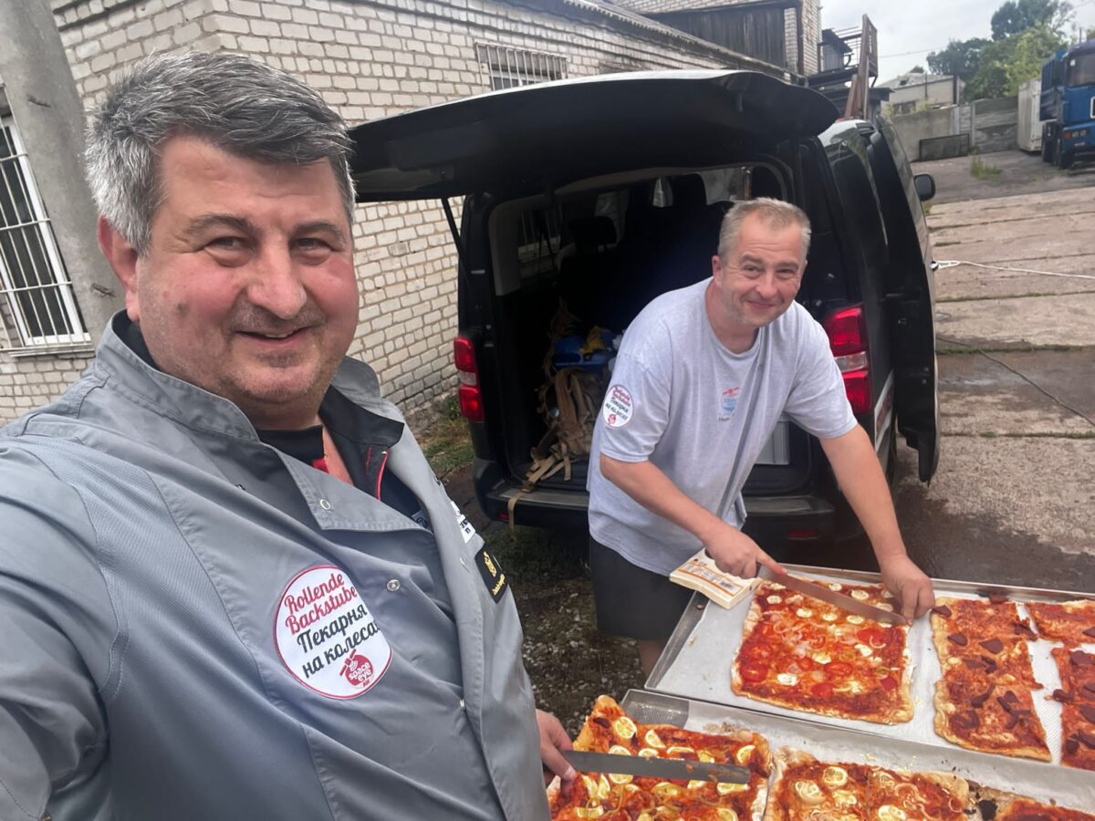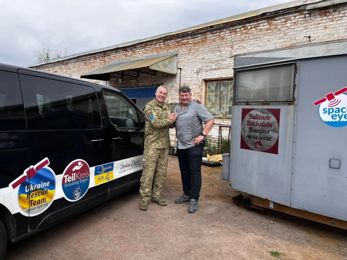 Seit zwei Jahren ist eine fahrbare Bäckerei für und von Space-Eye im Einsatz. Mehr als 100.000 Brote wurden seither von den ukrainischen Bäckerinnen und Bäckern kostenlos an arme Familien in zerbombten Dörfern verteilt und liefern so einen wichtigen Beitrag zur Ernährung der Menschen. Unterstützt wird das Projekt von Bäckermeister Reiner Dietl aus Elisabethszell (Niederbayern) und der Berliner Bäckerei Domberger, die bereits Erfahrung mit dem Einsatz einer mobilen Bäckerei hat.