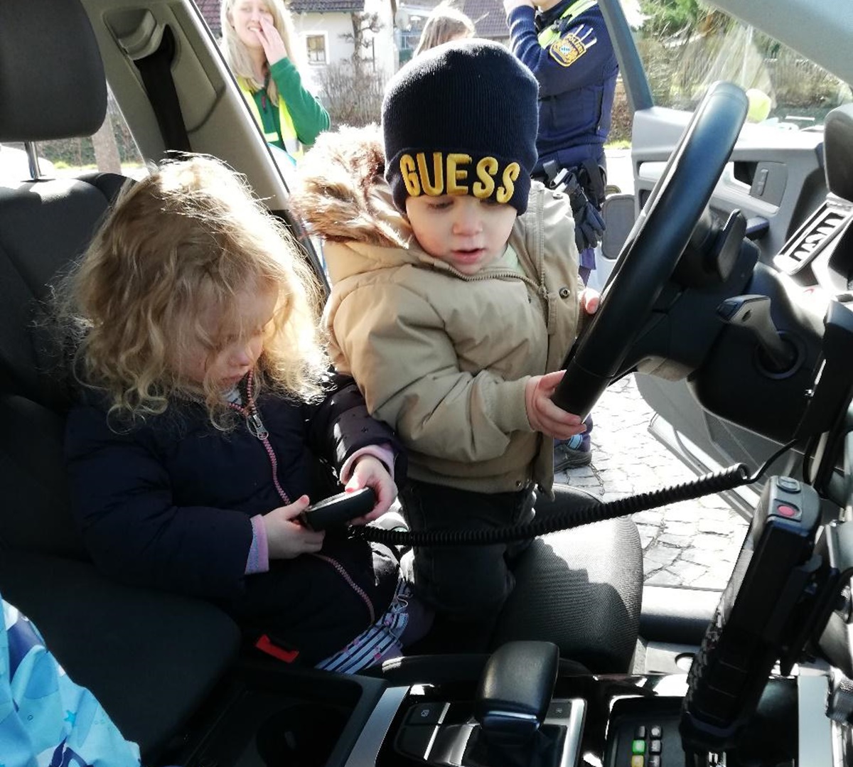 Vor Ort durften die Kinder das Polizeiauto ganz genau unter die Lupe nehmen. Viele krabbelten neugierig hinein, erkundeten den Innenraum und probierten mit Begeisterung die vielen Knöpfe und Funktionen aus. Polizistin Laura Schertl erklärte geduldig, was welches Gerät macht, und sorgte dafür, dass sich jedes Kind sicher und willkommen fühlte.