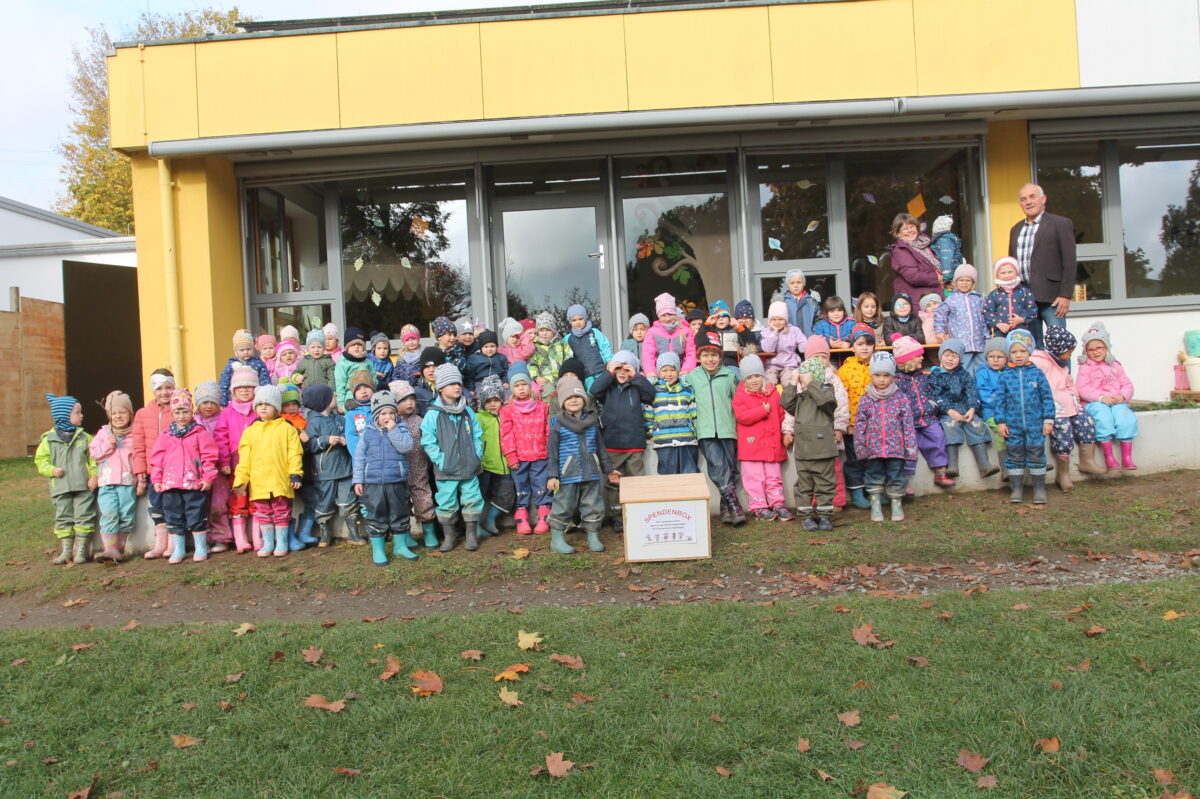 Seinen Wunsch, dafür etwas anzuschaffen, hat die Kindertagesstätte bereits umgesetzt. „Wir haben sieben Brotzeit-Bänke gekauft“, ließ Manuela Bauer wissen. „Sie sind täglich im Einsatz.“ Gemeinsam mit den Kindern sagte die Leiterin Lang ein herzliches „Vergelt’s Gott“. Und der versicherte, verbunden mit dem Dank an die vielen Spender: „Ich würde es wieder machen.“